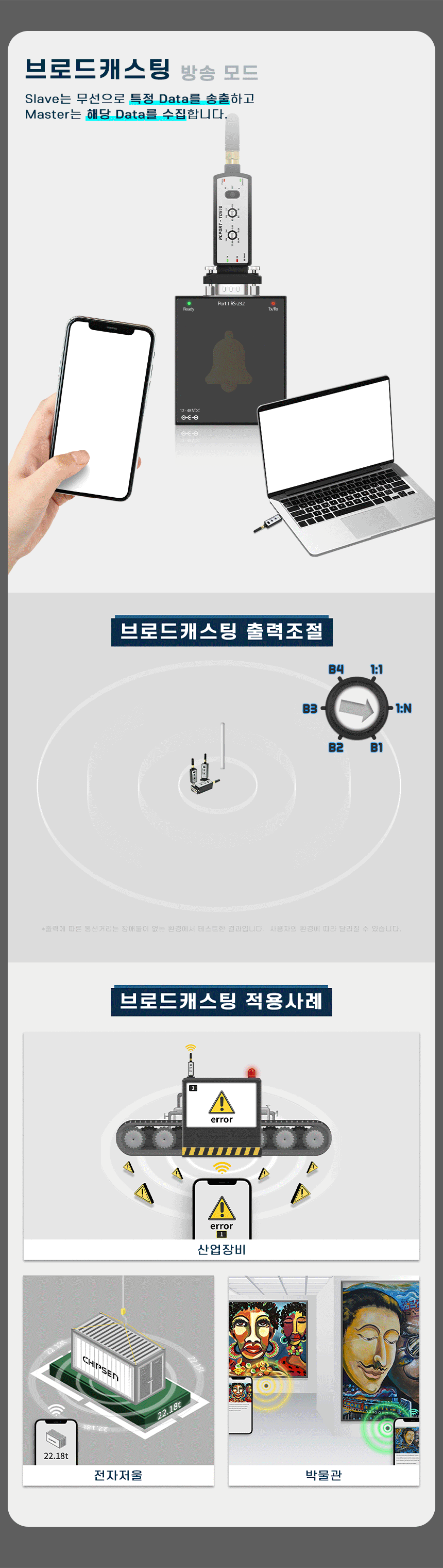 Battery type / 무선 RS232 to 블루투스 / 통신거리 300m / 브로드캐스팅(비콘) / 1:8 멀티통신 / 다양한 OS호환( iOS , Android, Window, Linux)