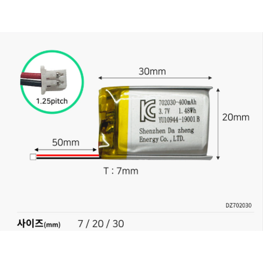 리튬폴리머배터리 3.7V DZ702030- 400mAh RC카 드론용 KC인증