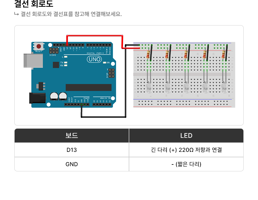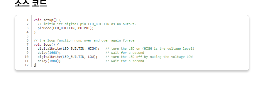 1 2 3 4 5 6 7 8 9 10 11 | void setup() { pinMode(LED_BUILTIN, OUTPUT); //내장 LED를 출력 핀으로 설정 } void loop() { digitalWrite(LED_BUILTIN, HIGH); // LED ON delay(1000); // 1초 동안 상태 유지(1000ms = 1s) digitalWrite(LED_BUILTIN, LOW); // LED OFF delay(1000); // 1초 동안 상태 유지(1000ms = 1s) } | cs |
