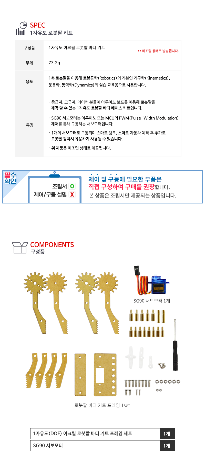아두이노 1자유도 로봇팔 키트 (아크릴, 서보모터 포함)