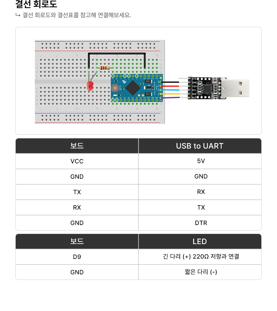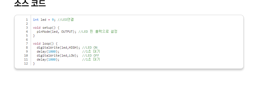 1 2 3 4 5 6 7 8 9 10 11 12 | int led = 9; //LED연결 void setup() { pinMode(led, OUTPUT); //LED 핀 출력으로 설정 } void loop() { digitalWrite(led,HIGH); //LED ON delay(1000); //1초 대기 digitalWrite(led,LOW); //LED OFF delay(1000); //1초 대기 } | cs |