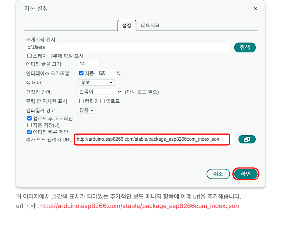 url 복사 : http://arduino.esp8266.com/stable/package_esp8266com_index.json