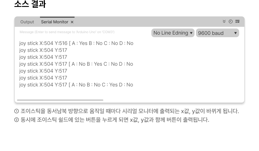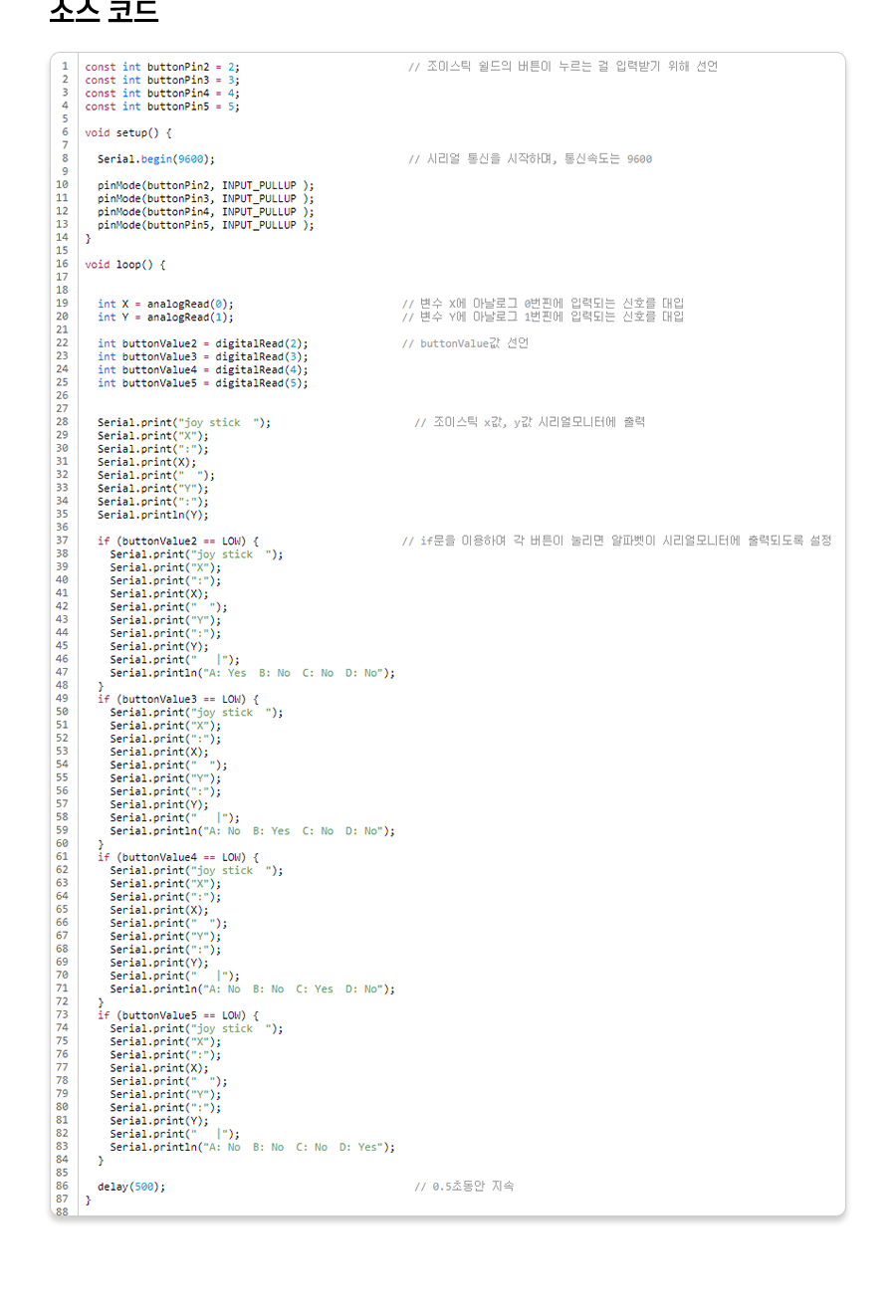 1 2 3 4 5 6 7 8 9 10 11 12 13 14 15 16 17 18 19 20 21 22 23 24 25 26 27 28 29 30 31 32 33 34 35 36 37 38 39 40 41 42 43 44 45 46 47 48 49 50 51 52 53 54 55 56 57 58 59 60 61 62 63 64 65 66 67 68 69 70 71 72 73 74 75 76 77 78 79 80 81 82 83 84 85 86 87 88 | const int buttonPin2 = 2; // 조이스틱 쉴드의 버튼이 누르는 걸 입력받기 위해 선언 const int buttonPin3 = 3; const int buttonPin4 = 4; const int buttonPin5 = 5; void setup() { Serial.begin(9600); // 시리얼 통신을 시작하며, 통신속도는 9600 pinMode(buttonPin2, INPUT_PULLUP ); pinMode(buttonPin3, INPUT_PULLUP ); pinMode(buttonPin4, INPUT_PULLUP ); pinMode(buttonPin5, INPUT_PULLUP ); } void loop() { int X = analogRead(0); // 변수 X에 아날로그 0번핀에 입력되는 신호를 대입 int Y = analogRead(1); // 변수 Y에 아날로그 1번핀에 입력되는 신호를 대입 int buttonValue2 = digitalRead(2); // buttonValue값 선언 int buttonValue3 = digitalRead(3); int buttonValue4 = digitalRead(4); int buttonValue5 = digitalRead(5); Serial.print("joy stick "); // 조이스틱 x값, y값 시리얼모니터에 출력 Serial.print("X"); Serial.print(":"); Serial.print(X); Serial.print(" "); Serial.print("Y"); Serial.print(":"); Serial.println(Y); if (buttonValue2 == LOW) { // if문을 이용하여 각 버튼이 눌리면 알파벳이 시리얼모니터에 출력되도록 설정 Serial.print("joy stick "); Serial.print("X"); Serial.print(":"); Serial.print(X); Serial.print(" "); Serial.print("Y"); Serial.print(":"); Serial.print(Y); Serial.print(" |"); Serial.println("A: Yes B: No C: No D: No"); } if (buttonValue3 == LOW) { Serial.print("joy stick "); Serial.print("X"); Serial.print(":"); Serial.print(X); Serial.print(" "); Serial.print("Y"); Serial.print(":"); Serial.print(Y); Serial.print(" |"); Serial.println("A: No B: Yes C: No D: No"); } if (buttonValue4 == LOW) { Serial.print("joy stick "); Serial.print("X"); Serial.print(":"); Serial.print(X); Serial.print(" "); Serial.print("Y"); Serial.print(":"); Serial.print(Y); Serial.print(" |"); Serial.println("A: No B: No C: Yes D: No"); } if (buttonValue5 == LOW) { Serial.print("joy stick "); Serial.print("X"); Serial.print(":"); Serial.print(X); Serial.print(" "); Serial.print("Y"); Serial.print(":"); Serial.print(Y); Serial.print(" |"); Serial.println("A: No B: No C: No D: Yes"); } delay(500); // 0.5초동안 지속 } | cs |