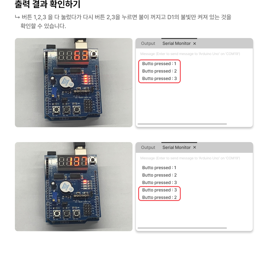 1 2 3 4 5 6 7 8 9 10 11 12 13 14 15 16 17 18 | #include <MFShield.h> MFShield mfs; void setup(){ Serial.begin(9600); mfs.onKeyPress([](uint8_t button){ mfs.beep(10); //부저에서 소리를 냅니다. mfs.setLed(button, !mfs.getLed(button)); Serial.println("Button Pressed:" +String(button)); }); } void loop(){ mfs.display(millis()/1000); // 7세그먼트에서 초(sec)가 나타나게 합니다. mfs.loop(); } | cs |