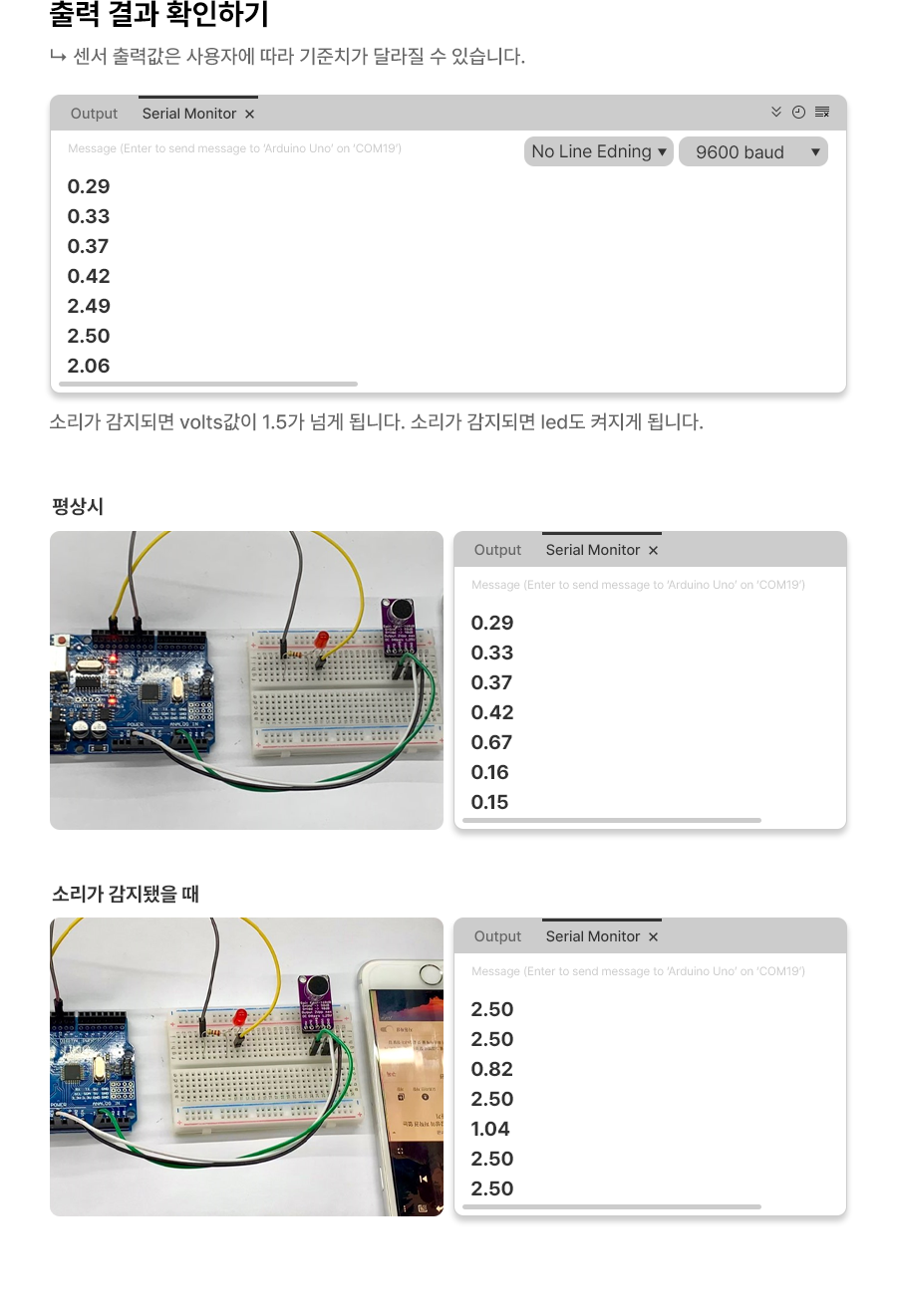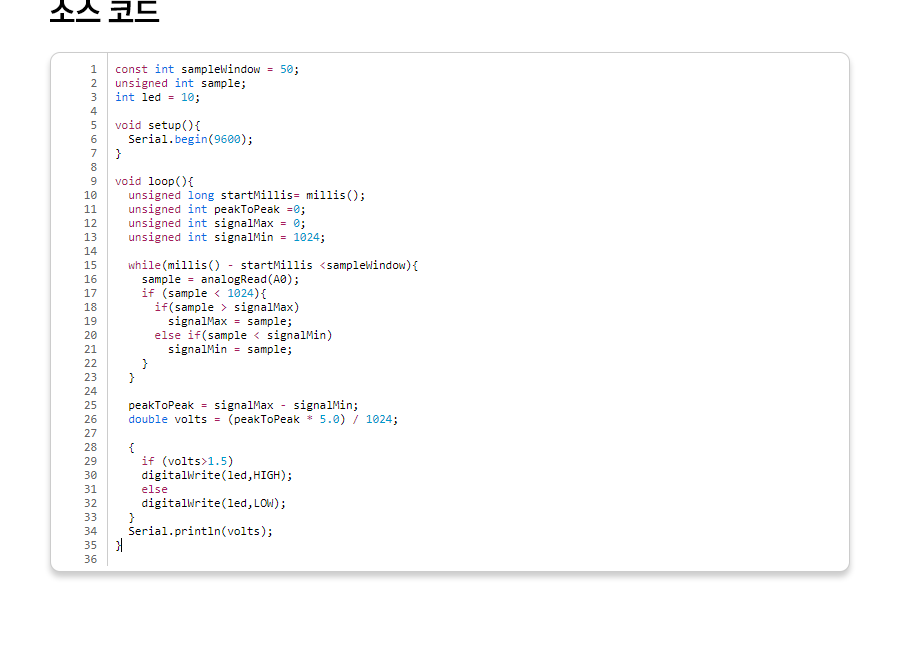 1 2 3 4 5 6 7 8 9 10 11 12 13 14 15 16 17 18 19 20 21 22 23 24 25 26 27 28 29 30 31 32 33 34 35 36 | const int sampleWindow = 50; unsigned int sample; int led = 10; void setup(){ Serial.begin(9600); } void loop(){ unsigned long startMillis= millis(); unsigned int peakToPeak =0; unsigned int signalMax = 0; unsigned int signalMin = 1024; while(millis() - startMillis <sampleWindow){ sample = analogRead(A0); if (sample < 1024){ if(sample > signalMax) signalMax = sample; else if(sample < signalMin) signalMin = sample; } } peakToPeak = signalMax - signalMin; double volts = (peakToPeak * 5.0) / 1024; { if (volts>1.5) digitalWrite(led,HIGH); else digitalWrite(led,LOW); } Serial.println(volts); } | cs |