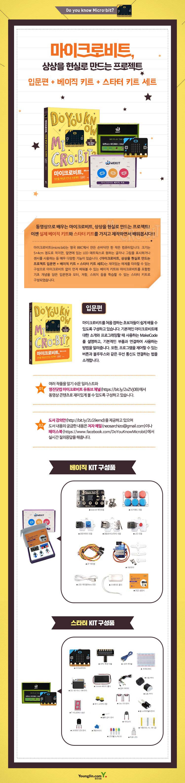 - 마이크로비트를 처음 접하는 입문자를 대상으로 기초 개념부터 여러 활용 사례 등을 알기 쉽게 많은 이미지와 영진닷컴 마이크로비트 유튜브 채널에서 동영상 콘텐츠로 재미있게 볼 수 있도록 구성하고 있습니다.