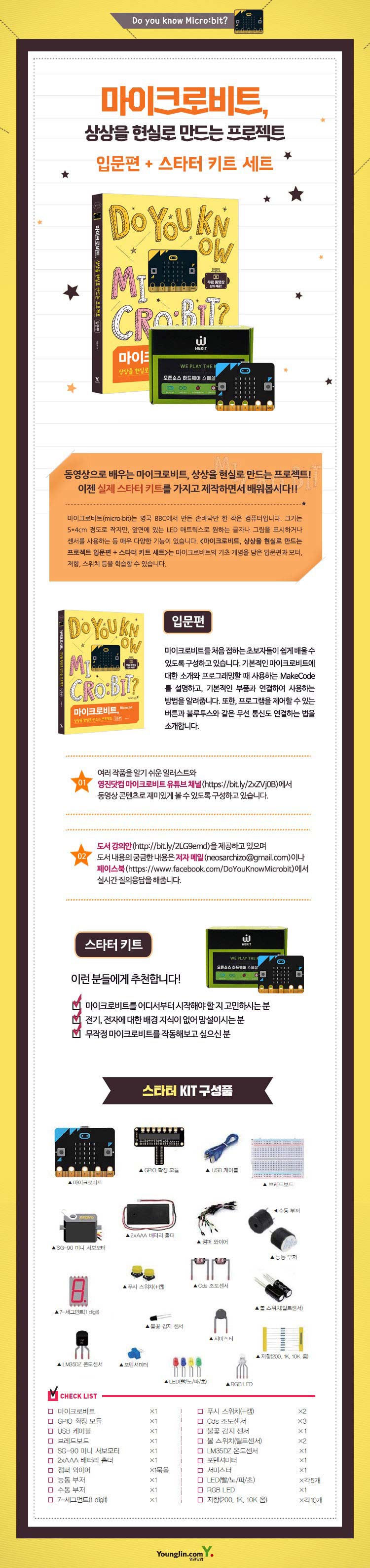 - 마이크로비트를 처음 접하는 입문자를 대상으로 기초 개념부터 여러 활용 사례 등을 알기 쉽게 많은 이미지와 영진닷컴 마이크로비트 유튜브 채널에서 동영상 콘텐츠로 재미있게 볼 수 있도록 구성하고 있습니다.