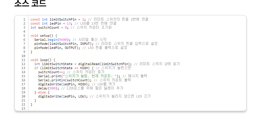 1 2 3 4 5 6 7 8 9 10 11 12 13 14 15 16 17 18 19 20 21 22 23 24 25 | const int limitSwitchPin = 2; // 리미트 스위치의 핀을 2번에 연결 const int ledPin = 13; // LED를 13번 핀에 연결 int switchCount = 0; // 스위치 카운터 초기화 void setup() { Serial.begin(9600); // 시리얼 통신 시작 pinMode(limitSwitchPin, INPUT); // 리미트 스위치 핀을 입력으로 설정 pinMode(ledPin, OUTPUT); // LED 핀을 출력으로 설정 } void loop() { int limitSwitchState = digitalRead(limitSwitchPin); // 리미트 스위치 상태 읽기 if (limitSwitchState == HIGH) { // 스위치가 눌렸으면 switchCount++; // 스위치 카운터 증가 Serial.print("스위치가 눌림. 현재 카운트: "); // 메시지 출력 Serial.println(switchCount); // 스위치 카운트 출력 digitalWrite(ledPin, HIGH); // LED를 켜기 delay(500); // 디바운스를 위해 짧은 딜레이 추가 } else { digitalWrite(ledPin, LOW); // 스위치가 눌리지 않으면 LED 끄기 } } | cs |