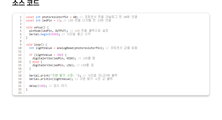 1 2 3 4 5 6 7 8 9 10 11 12 13 14 15 16 17 18 19 20 21 22 23 24 | const int photoBreakPin = A0; // 포토 브레이크 센서 핀을 아날로그 핀 A0에 연결 const int ledPin = 13; // LED 핀을 디지털 핀 13에 연결 void setup() { Serial.begin(9600); // 시리얼 통신 시작 pinMode(ledPin, OUTPUT); // LED 핀을 출력으로 설정 } void loop() { int photoBreakValue = analogRead(photoBreakPin); // 포토 브레이크 센서 값을 읽음 Serial.print("포토 브레이크 센서 값: "); // 시리얼 모니터에 출력 Serial.println(photoBreakValue); // 포토 브레이크 센서 값 출력 if (photoBreakValue < 500) { // 포토 브레이크 센서 값이 임계값보다 작으면 digitalWrite(ledPin, HIGH); // LED를 켬 } else { digitalWrite(ledPin, LOW); // 그렇지 않으면 LED를 끔 } delay(1000); // 1초 대기 } | cs |