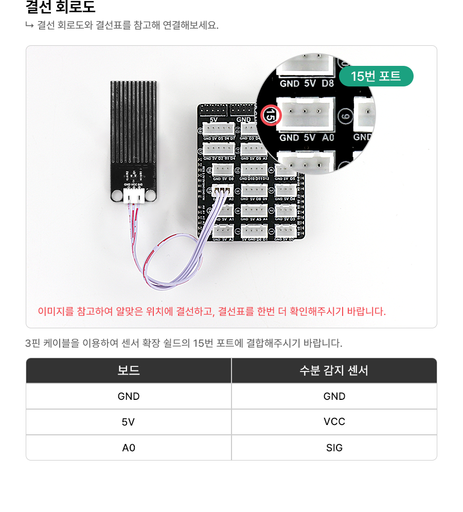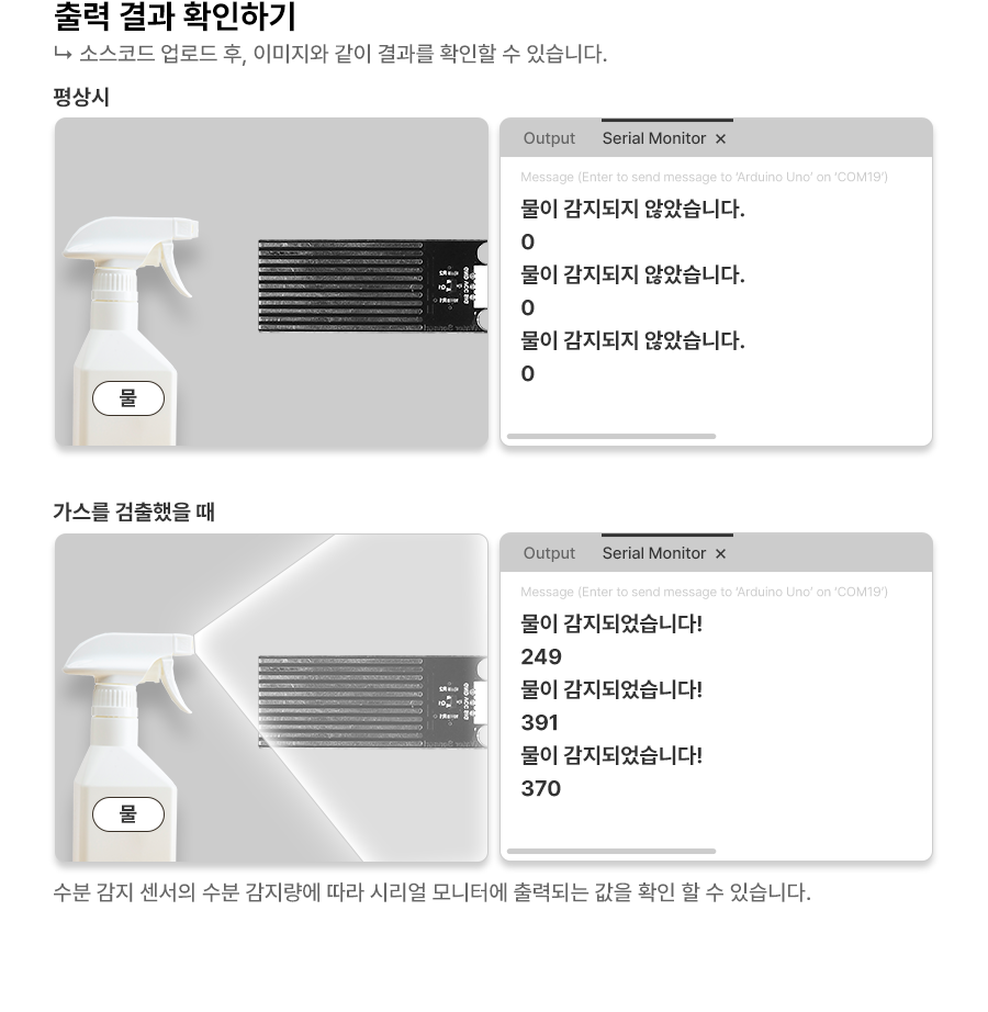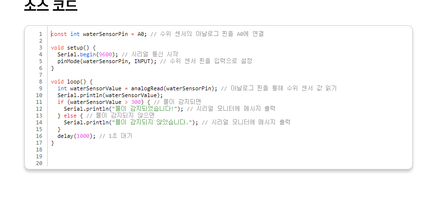 1 2 3 4 5 6 7 8 9 10 11 12 13 14 15 16 17 18 19 20 | const int waterSensorPin = A0; // 수위 센서의 아날로그 핀을 A0에 연결 void setup() { Serial.begin(9600); // 시리얼 통신 시작 pinMode(waterSensorPin, INPUT); // 수위 센서 핀을 입력으로 설정 } void loop() { int waterSensorValue = analogRead(waterSensorPin); // 아날로그 핀을 통해 수위 센서 값 읽기 Serial.println(waterSensorValue); if (waterSensorValue > 300) { // 물이 감지되면 Serial.println("물이 감지되었습니다!"); // 시리얼 모니터에 메시지 출력 } else { // 물이 감지되지 않으면 Serial.println("물이 감지되지 않았습니다."); // 시리얼 모니터에 메시지 출력 } delay(1000); // 1초 대기 } | cs |