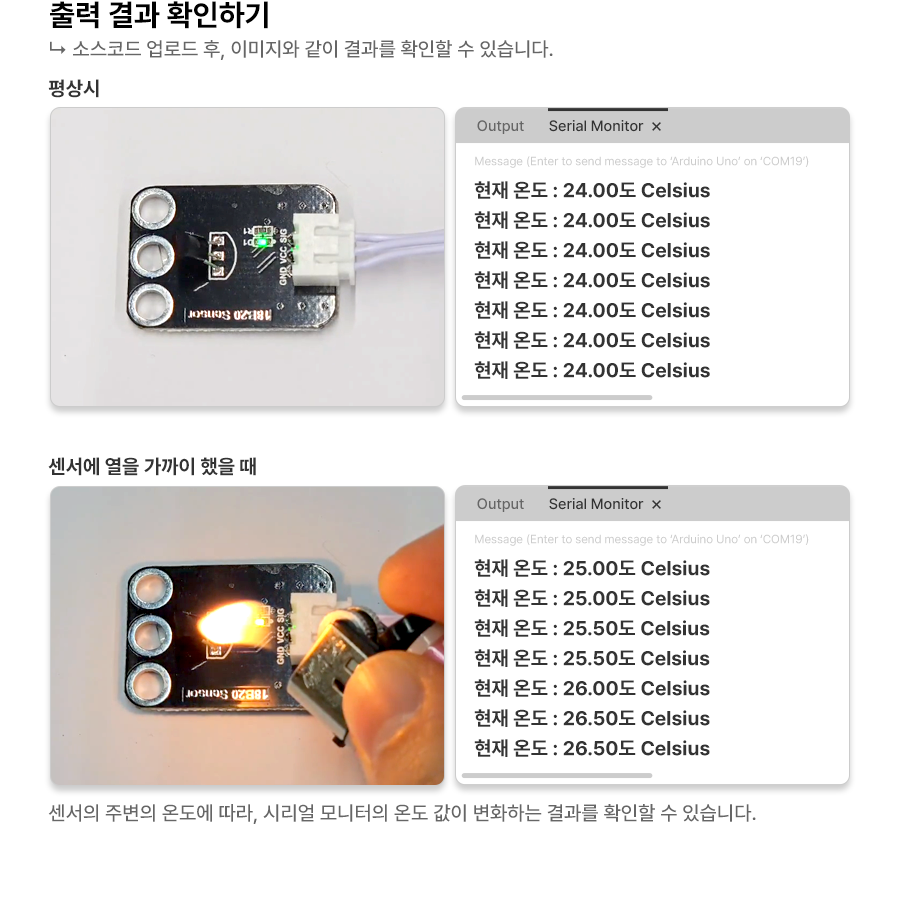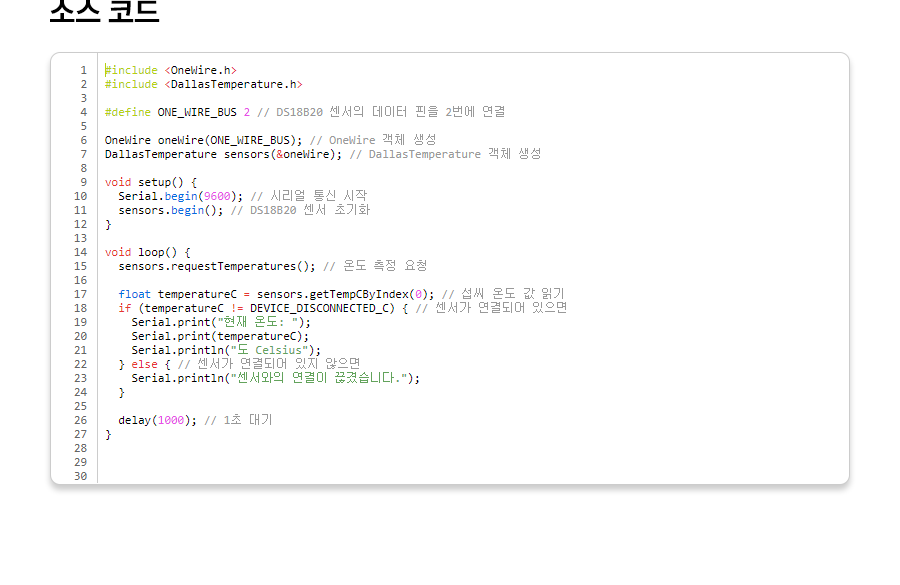 1 2 3 4 5 6 7 8 9 10 11 12 13 14 15 16 17 18 19 20 21 22 23 24 25 26 27 28 29 30 | #include <OneWire.h> #include <DallasTemperature.h> #define ONE_WIRE_BUS 2 // DS18B20 센서의 데이터 핀을 2번에 연결 OneWire oneWire(ONE_WIRE_BUS); // OneWire 객체 생성 DallasTemperature sensors(&oneWire); // DallasTemperature 객체 생성 void setup() { Serial.begin(9600); // 시리얼 통신 시작 sensors.begin(); // DS18B20 센서 초기화 } void loop() { sensors.requestTemperatures(); // 온도 측정 요청 float temperatureC = sensors.getTempCByIndex(0); // 섭씨 온도 값 읽기 if (temperatureC != DEVICE_DISCONNECTED_C) { // 센서가 연결되어 있으면 Serial.print("현재 온도: "); Serial.print(temperatureC); Serial.println("도 Celsius"); } else { // 센서가 연결되어 있지 않으면 Serial.println("센서와의 연결이 끊겼습니다."); } delay(1000); // 1초 대기 } | cs |
