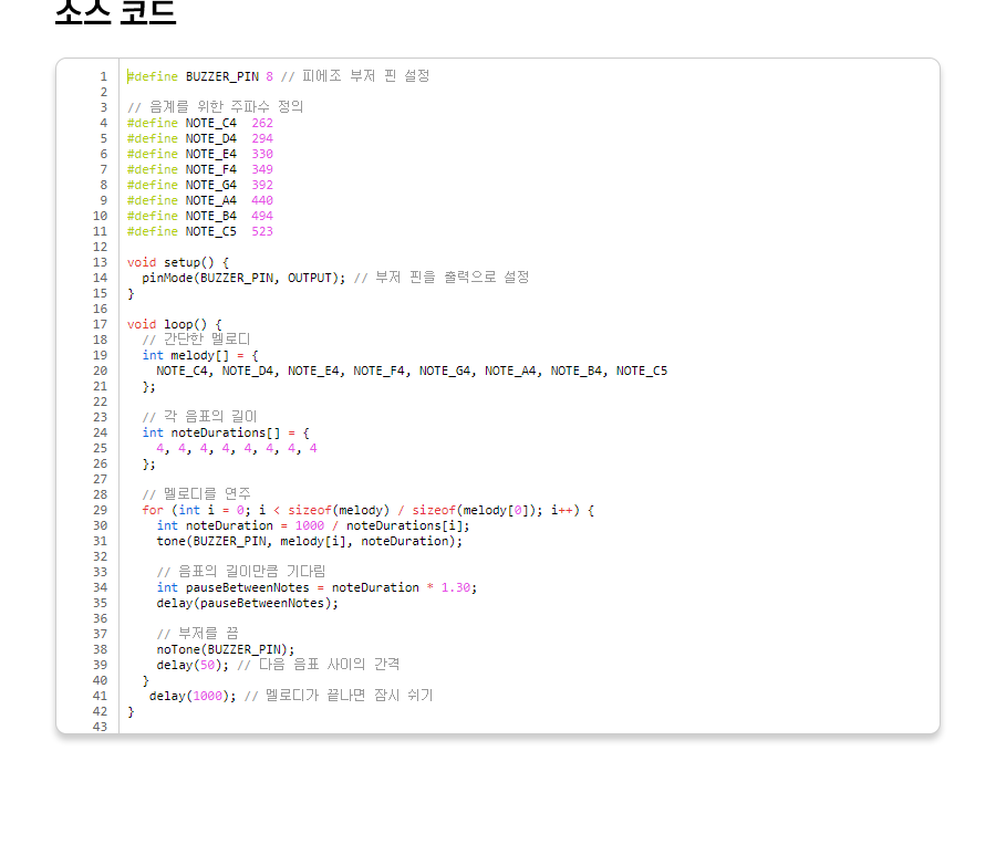1 2 3 4 5 6 7 8 9 10 11 12 13 14 15 16 17 18 19 20 21 22 23 24 25 26 27 28 29 30 31 32 33 34 35 36 37 38 39 40 41 42 43 | #define BUZZER_PIN 8 // 피에조 부저 핀 설정 // 음계를 위한 주파수 정의 #define NOTE_C4 262 #define NOTE_D4 294 #define NOTE_E4 330 #define NOTE_F4 349 #define NOTE_G4 392 #define NOTE_A4 440 #define NOTE_B4 494 #define NOTE_C5 523 void setup() { pinMode(BUZZER_PIN, OUTPUT); // 부저 핀을 출력으로 설정 } void loop() { // 간단한 멜로디 int melody[] = { NOTE_C4, NOTE_D4, NOTE_E4, NOTE_F4, NOTE_G4, NOTE_A4, NOTE_B4, NOTE_C5 }; // 각 음표의 길이 int noteDurations[] = { 4, 4, 4, 4, 4, 4, 4, 4 }; // 멜로디를 연주 for (int i = 0; i < sizeof(melody) / sizeof(melody[0]); i++) { int noteDuration = 1000 / noteDurations[i]; tone(BUZZER_PIN, melody[i], noteDuration); // 음표의 길이만큼 기다림 int pauseBetweenNotes = noteDuration * 1.30; delay(pauseBetweenNotes); // 부저를 끔 noTone(BUZZER_PIN); delay(50); // 다음 음표 사이의 간격 } delay(1000); // 멜로디가 끝나면 잠시 쉬기 } | cs |