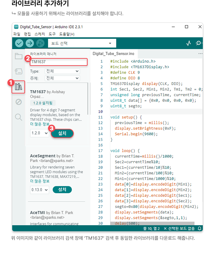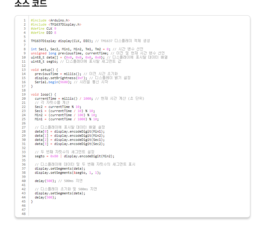 1 2 3 4 5 6 7 8 9 10 11 12 13 14 15 16 17 18 19 20 21 22 23 24 25 26 27 28 29 30 31 32 33 34 35 36 37 38 39 40 41 42 43 44 45 46 47 48 | #include <Arduino.h> #include <TM1637Display.h> #define CLK 9 #define DIO 8 TM1637Display display(CLK, DIO); // TM1637 디스플레이 객체 생성 int Sec1, Sec2, Min1, Min2, Tm1, Tm2 = 0; // 시간 변수 선언 unsigned long previousTime, currentTime; // 이전 및 현재 시간 변수 선언 uint8_t data[] = {0x0, 0x0, 0x0, 0x0}; // 디스플레이에 표시할 데이터 배열 uint8_t segto; // 디스플레이에 표시할 세그먼트 값 void setup() { previousTime = millis(); // 이전 시간 초기화 display.setBrightness(0xF); // 디스플레이 밝기 설정 Serial.begin(9600); // 시리얼 통신 시작 } void loop() { currentTime = millis() / 1000; // 현재 시간 계산 (초 단위) // 각 자릿수를 계산 Sec2 = currentTime % 10; Sec1 = (currentTime / 10) % 10; Min2 = (currentTime / 100) % 10; Min1 = (currentTime / 1000) % 10; // 디스플레이에 표시할 데이터 배열 설정 data[0] = display.encodeDigit(Min1); data[1] = display.encodeDigit(Min2); data[2] = display.encodeDigit(Sec1); data[3] = display.encodeDigit(Sec2); // 두 번째 자릿수의 세그먼트 설정 segto = 0x80 | display.encodeDigit(Min2); // 디스플레이에 데이터 및 두 번째 자릿수의 세그먼트 표시 display.setSegments(data); display.setSegments(&segto, 1, 1); delay(500); // 500ms 지연 // 디스플레이 초기화 및 500ms 지연 display.setSegments(data); delay(500); } | cs |