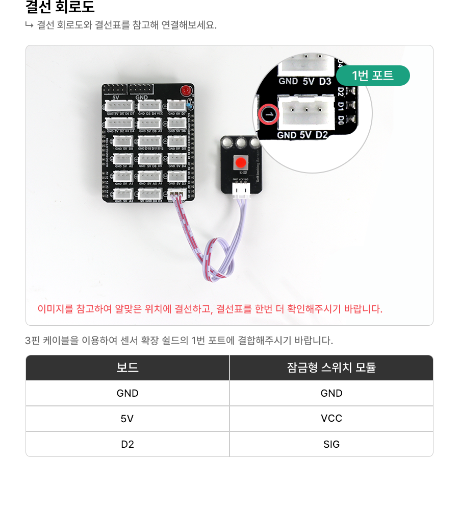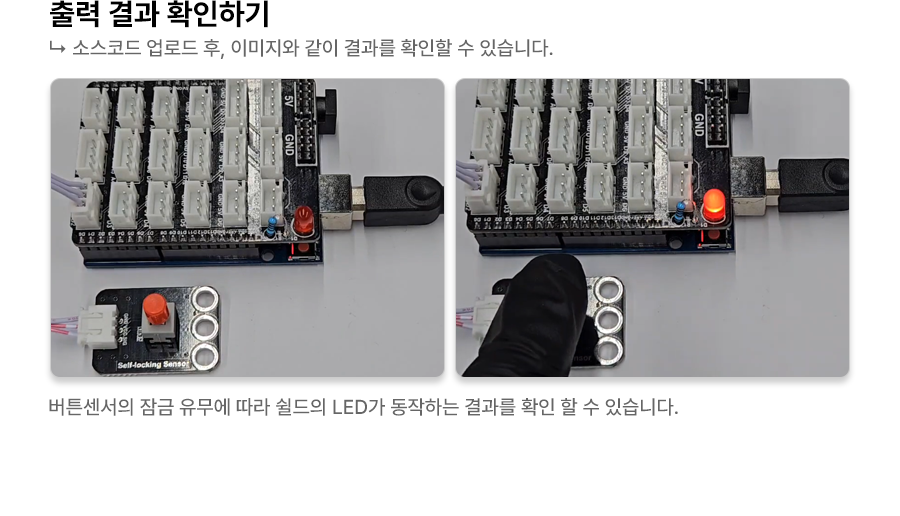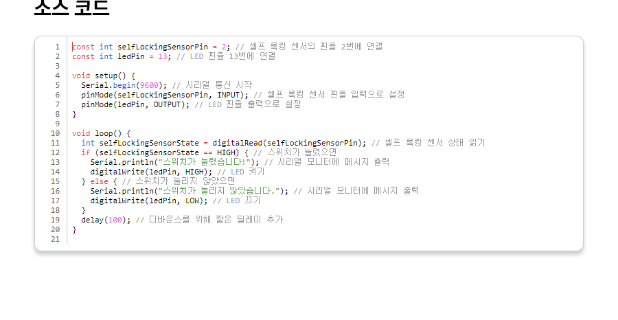 1 2 3 4 5 6 7 8 9 10 11 12 13 14 15 16 17 18 19 20 21 | const int selfLockingSensorPin = 2; // 셀프 록킹 센서의 핀을 2번에 연결 const int ledPin = 13; // LED 핀을 13번에 연결 void setup() { Serial.begin(9600); // 시리얼 통신 시작 pinMode(selfLockingSensorPin, INPUT); // 셀프 록킹 센서 핀을 입력으로 설정 pinMode(ledPin, OUTPUT); // LED 핀을 출력으로 설정 } void loop() { int selfLockingSensorState = digitalRead(selfLockingSensorPin); // 셀프 록킹 센서 상태 읽기 if (selfLockingSensorState == HIGH) { // 스위치가 눌렸으면 Serial.println("스위치가 눌렸습니다!"); // 시리얼 모니터에 메시지 출력 digitalWrite(ledPin, HIGH); // LED 켜기 } else { // 스위치가 눌리지 않았으면 Serial.println("스위치가 눌리지 않았습니다."); // 시리얼 모니터에 메시지 출력 digitalWrite(ledPin, LOW); // LED 끄기 } delay(100); // 디바운스를 위해 짧은 딜레이 추가 } | cs |