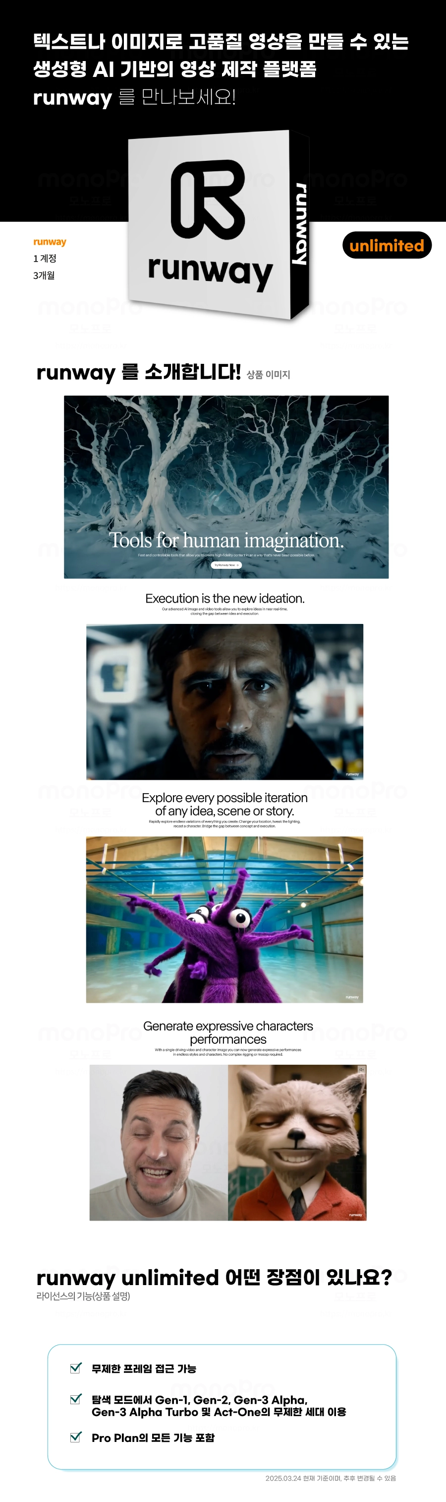 텍스트 프롬프트만으로 고품질 AI 영상을 무제한 생성·편집할 수 있는 런웨이의 최상위 구독 서비스입니다