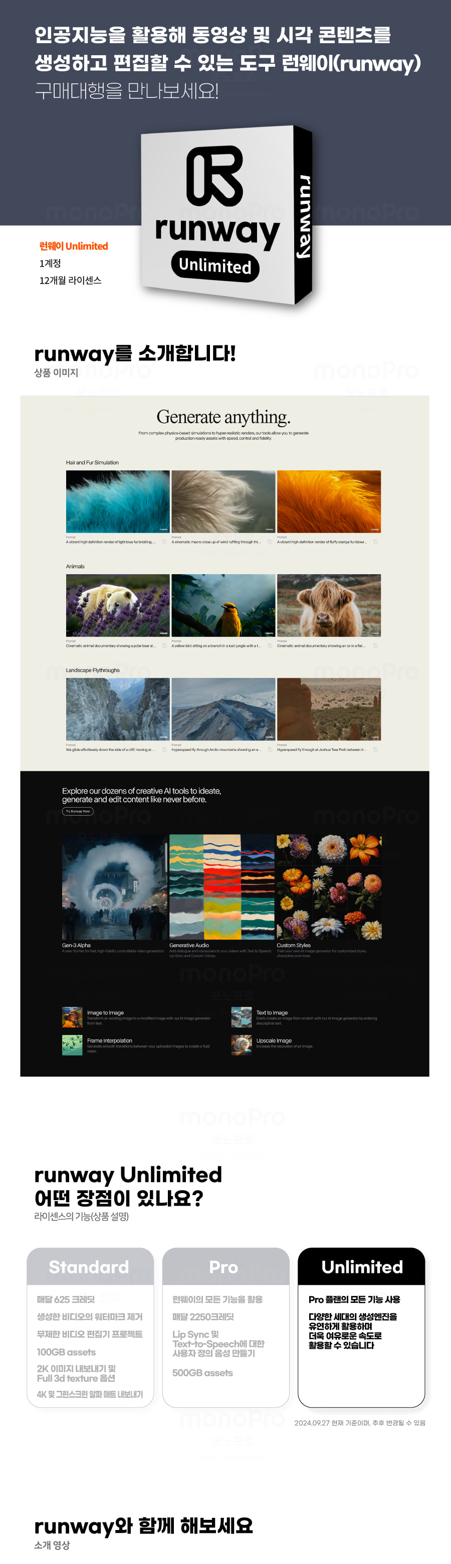 텍스트 프롬프트만으로 고품질 AI 영상을 무제한 생성·편집할 수 있는 런웨이의 최상위 구독 서비스입니다