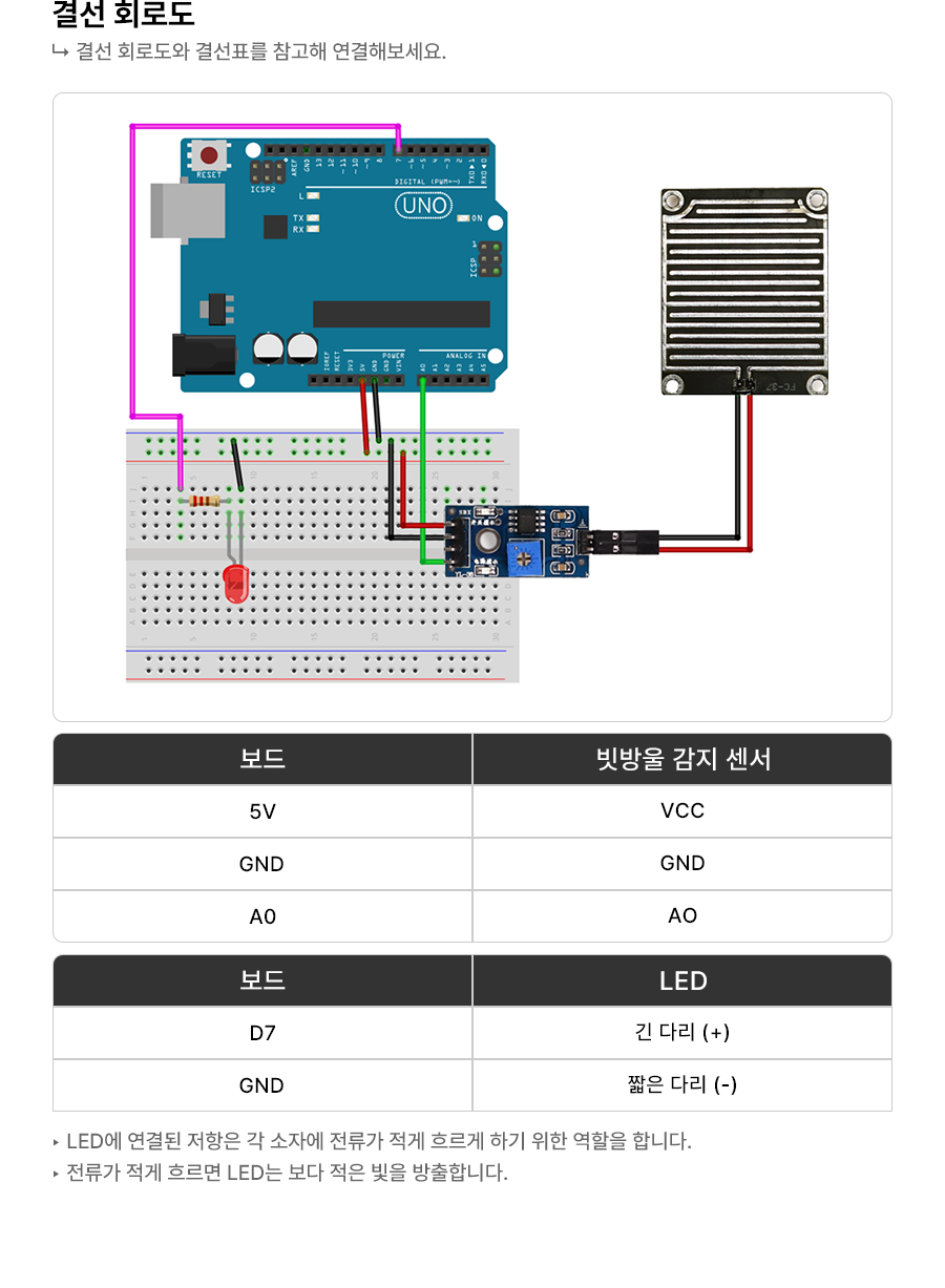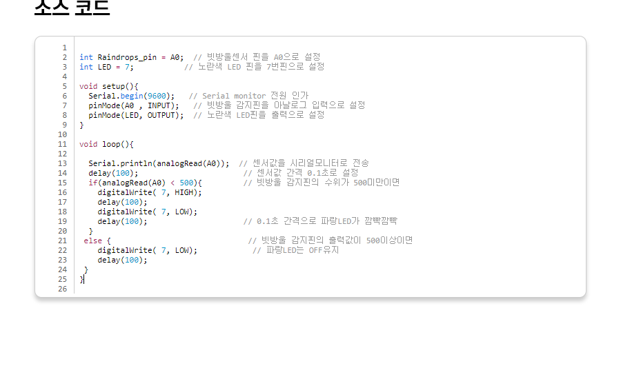 1 2 3 4 5 6 7 8 9 10 11 12 13 14 15 16 17 18 19 20 21 22 23 24 25 26 | int Raindrops_pin = A0; // 빗방울센서 핀을 A0으로 설정 int LED = 7; // 노란색 LED 핀을 7번핀으로 설정 void setup(){ Serial.begin(9600); // Serial monitor 전원 인가 pinMode(A0 , INPUT); // 빗방울 감지핀을 아날로그 입력으로 설정 pinMode(LED, OUTPUT); // 노란색 LED핀을 출력으로 설정 } void loop(){ Serial.println(analogRead(A0)); // 센서값을 시리얼모니터로 전송 delay(100); // 센서값 간격 0.1초로 설정 if(analogRead(A0) < 500){ // 빗방울 감지핀의 수위가 500미만이면 digitalWrite( 7, HIGH); delay(100); digitalWrite( 7, LOW); delay(100); // 0.1초 간격으로 파랑LED가 깜빡깜빡 } else { // 빗방울 감지핀의 출력값이 500이상이면 digitalWrite( 7, LOW); // 파랑LED는 OFF유지 delay(100); } } | cs |