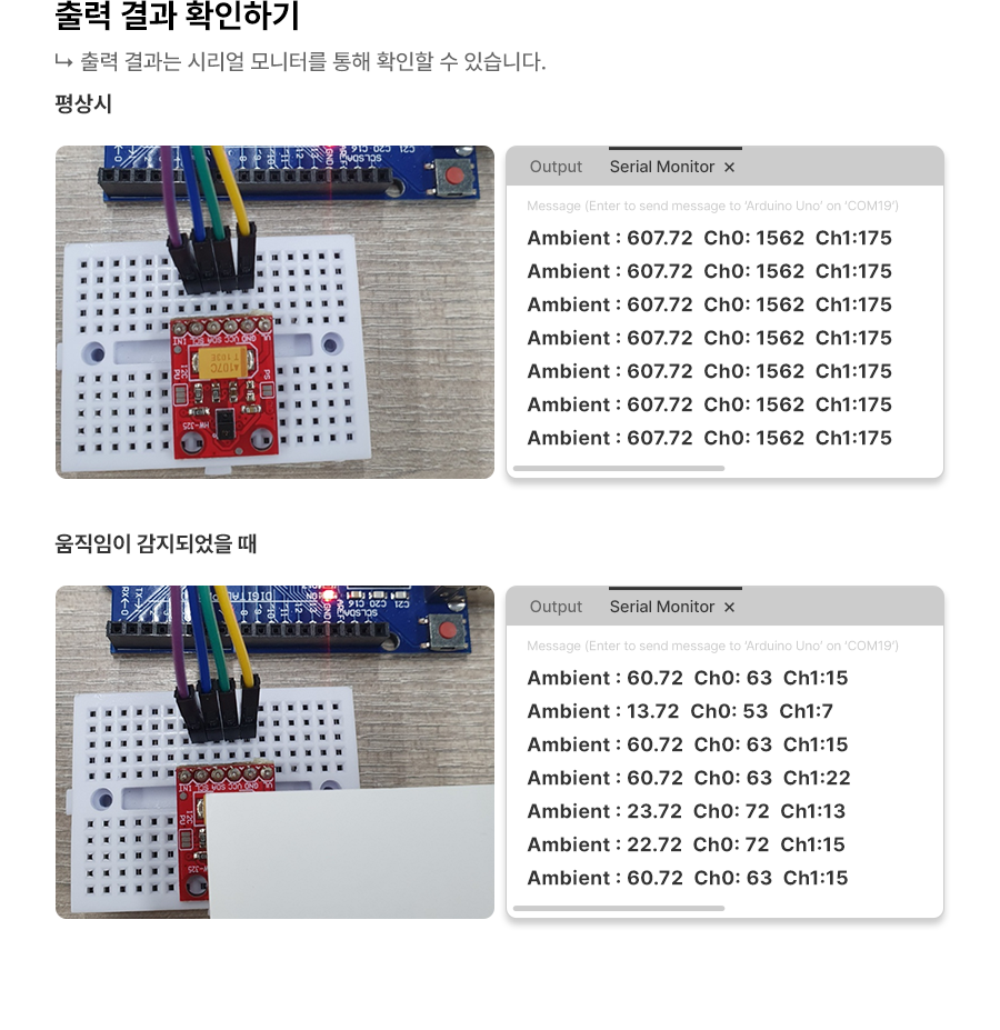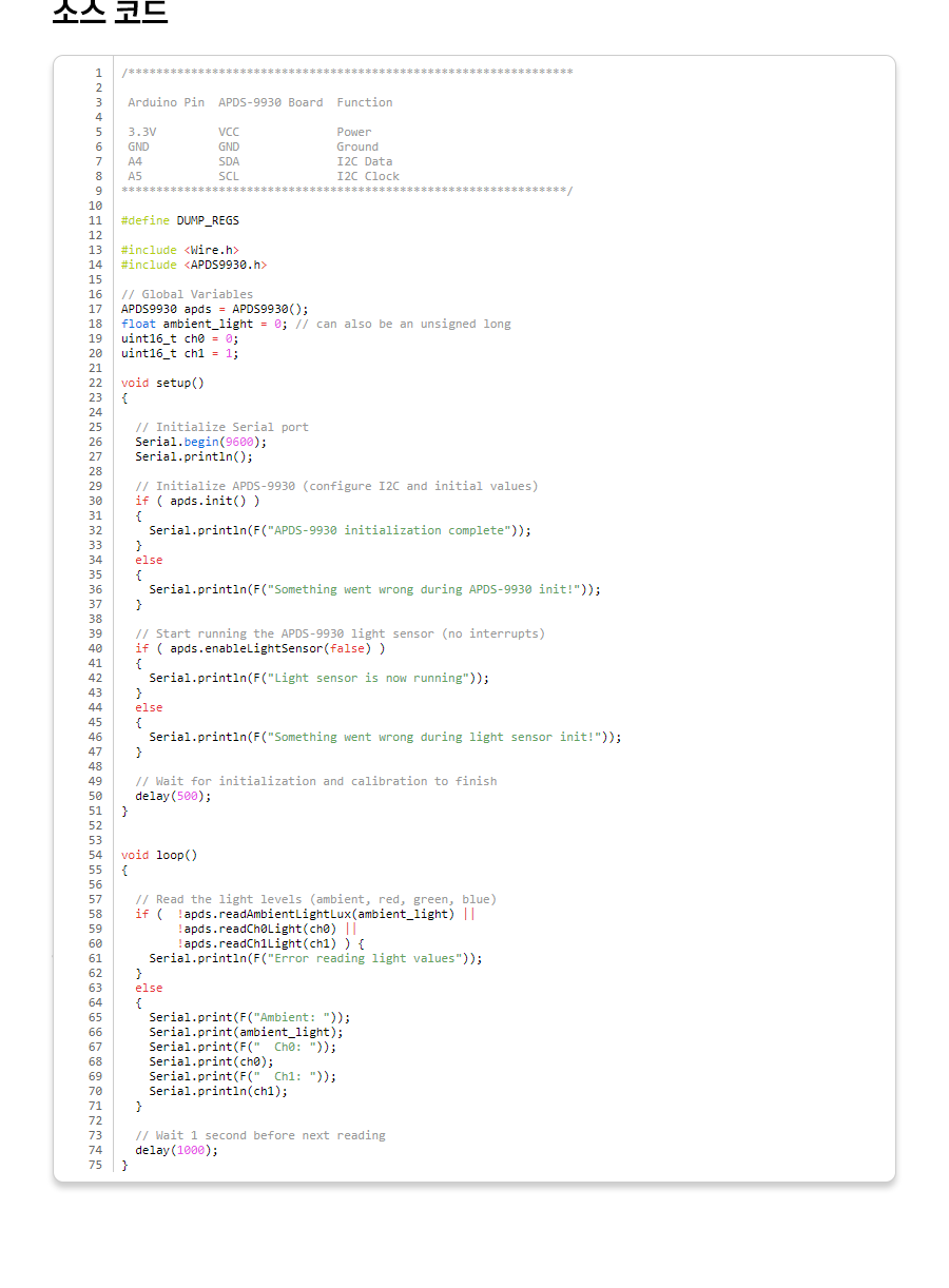 1 2 3 4 5 6 7 8 9 10 11 12 13 14 15 16 17 18 19 20 21 22 23 24 25 26 27 28 29 30 31 32 33 34 35 36 37 38 39 40 41 42 43 44 45 46 47 48 49 50 51 52 53 54 55 56 57 58 59 60 61 62 63 64 65 66 67 68 69 70 71 72 73 74 75 | /**************************************************************** Arduino Pin APDS-9930 Board Function 3.3V VCC Power GND GND Ground A4 SDA I2C Data A5 SCL I2C Clock ****************************************************************/ #define DUMP_REGS #include <Wire.h> #include <APDS9930.h> // Global Variables APDS9930 apds = APDS9930(); float ambient_light = 0; // can also be an unsigned long uint16_t ch0 = 0; uint16_t ch1 = 1; void setup() { // Initialize Serial port Serial.begin(9600); Serial.println(); // Initialize APDS-9930 (configure I2C and initial values) if ( apds.init() ) { Serial.println(F("APDS-9930 initialization complete")); } else { Serial.println(F("Something went wrong during APDS-9930 init!")); } // Start running the APDS-9930 light sensor (no interrupts) if ( apds.enableLightSensor(false) ) { Serial.println(F("Light sensor is now running")); } else { Serial.println(F("Something went wrong during light sensor init!")); } // Wait for initialization and calibration to finish delay(500); } void loop() { // Read the light levels (ambient, red, green, blue) if ( !apds.readAmbientLightLux(ambient_light) || !apds.readCh0Light(ch0) || !apds.readCh1Light(ch1) ) { Serial.println(F("Error reading light values")); } else { Serial.print(F("Ambient: ")); Serial.print(ambient_light); Serial.print(F(" Ch0: ")); Serial.print(ch0); Serial.print(F(" Ch1: ")); Serial.println(ch1); } // Wait 1 second before next reading delay(1000); } | cs |