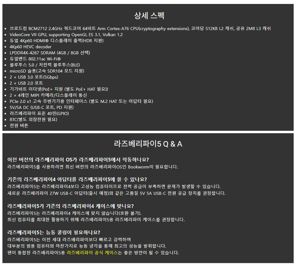 브로드컴 BCM2712 2.4GHz 쿼드코어 ARM Cortex-A76 / 듀얼 4Kp60 / 블루투스 5.0 , BLE / microSD(SDR104 모드 지원) / RTC 및 전원 버튼 내장 / 전원 : usb-C 포트 5V/5A DC 아답터 권장
