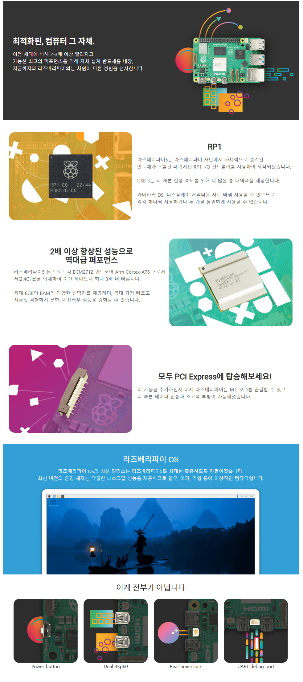 브로드컴 BCM2712 2.4GHz 쿼드코어 ARM Cortex-A76 / 듀얼 4Kp60 / 블루투스 5.0 , BLE / microSD(SDR104 모드 지원) / RTC 및 전원 버튼 내장 / 전원 : usb-C 포트 5V/5A DC 아답터 권장