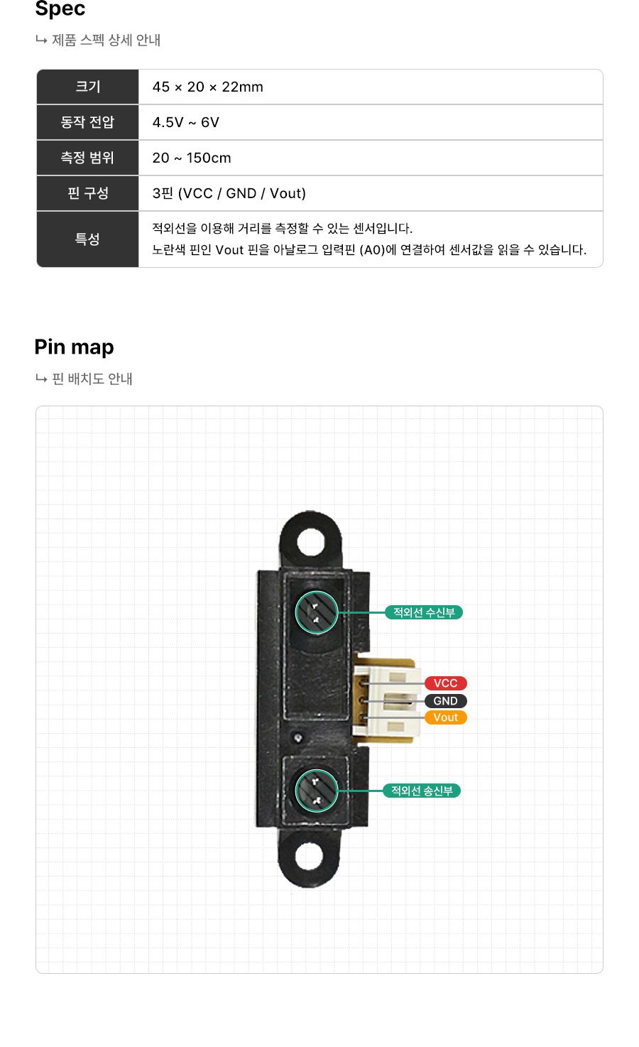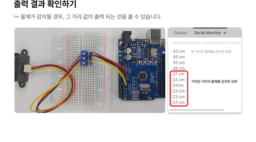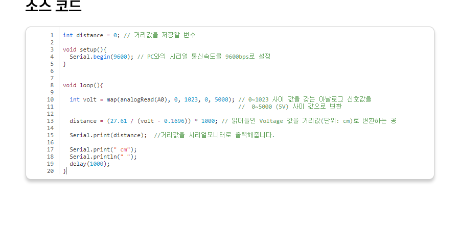 1 2 3 4 5 6 7 8 9 10 11 12 13 14 15 16 17 18 19 20 | int distance = 0; // 거리값을 저장할 변수 void setup(){ Serial.begin(9600); // PC와의 시리얼 통신속도를 9600bps로 설정 } void loop(){ int volt = map(analogRead(A0), 0, 1023, 0, 5000); // 0~1023 사이 값을 갖는 아날로그 신호값을 // 0~5000 (5V) 사이 값으로 변환 distance = (27.61 / (volt - 0.1696)) * 1000; // 읽어들인 Voltage 값을 거리값(단위: cm)로 변환하는 공 Serial.print(distance); //거리값을 시리얼모니터로 출력해줍니다. Serial.print(" cm"); Serial.println(" "); delay(1000); } | cs |
