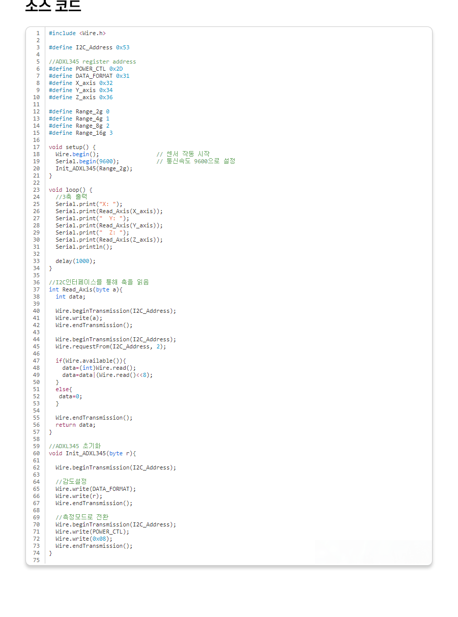 1 2 3 4 5 6 7 8 9 10 11 12 13 14 15 16 17 18 19 20 21 22 23 24 25 26 27 28 29 30 31 32 33 34 35 36 37 38 39 40 41 42 43 44 45 46 47 48 49 50 51 52 53 54 55 56 57 58 59 60 61 62 63 64 65 66 67 68 69 70 71 72 73 74 75 | #include <Wire.h> #define I2C_Address 0x53 //ADXL345 register address #define POWER_CTL 0x2D #define DATA_FORMAT 0x31 #define X_axis 0x32 #define Y_axis 0x34 #define Z_axis 0x36 #define Range_2g 0 #define Range_4g 1 #define Range_8g 2 #define Range_16g 3 void setup() { Wire.begin(); // 센서 작동 시작 Serial.begin(9600); // 통신속도 9600으로 설정 Init_ADXL345(Range_2g); } void loop() { //3축 출력 Serial.print("X: "); Serial.print(Read_Axis(X_axis)); Serial.print(" Y: "); Serial.print(Read_Axis(Y_axis)); Serial.print(" Z: "); Serial.print(Read_Axis(Z_axis)); Serial.println(); delay(1000); } //I2C인터페이스를 통해 축을 읽음 int Read_Axis(byte a){ int data; Wire.beginTransmission(I2C_Address); Wire.write(a); Wire.endTransmission(); Wire.beginTransmission(I2C_Address); Wire.requestFrom(I2C_Address, 2); if(Wire.available()){ data=(int)Wire.read(); data=data|(Wire.read()<<8); } else{ data=0; } Wire.endTransmission(); return data; } //ADXL345 초기화 void Init_ADXL345(byte r){ Wire.beginTransmission(I2C_Address); //감도설정 Wire.write(DATA_FORMAT); Wire.write(r); Wire.endTransmission(); //측정모드로 전환 Wire.beginTransmission(I2C_Address); Wire.write(POWER_CTL); Wire.write(0x08); Wire.endTransmission(); } | cs |