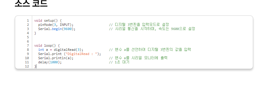1 2 3 4 5 6 7 8 9 10 11 12 | void setup() { pinMode(3, INPUT); // 디지털 3번핀을 입력모드로 설정 Serial.begin(9600); // 시리얼 통신을 시작하며, 속도는 9600으로 설정 } void loop() { int a = digitalRead(3); // 변수 a를 선언하여 디지털 3번핀의 값을 입력 Serial.print ("DigitalRead : "); Serial.println(a); // 변수 a를 시리얼 모니터에 출력 delay(1000); // 1초 대기 } | cs |