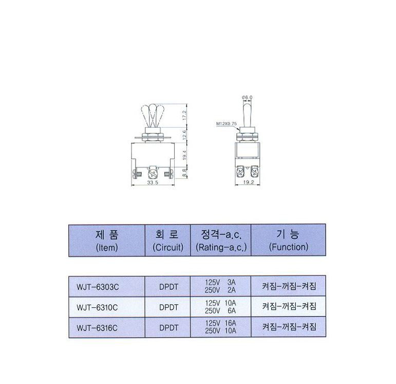WJT-6310C ON-OFF-ON 양쪽복귀 토글 TOGGLE 스위치 12파이 6P 우진전기