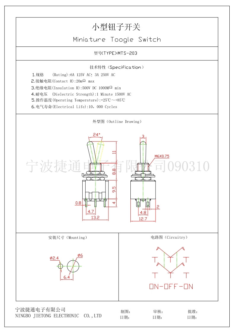 MTS-203 ON-OFF-ON 3단 토글 스위치 TOGGLE SWITCH 6파이