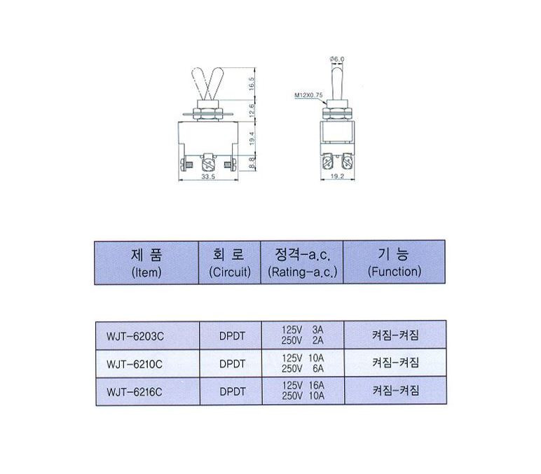 WJT-6210C ON-ON 토글 TOGGLE 스위치 12파이 6P 우진전기