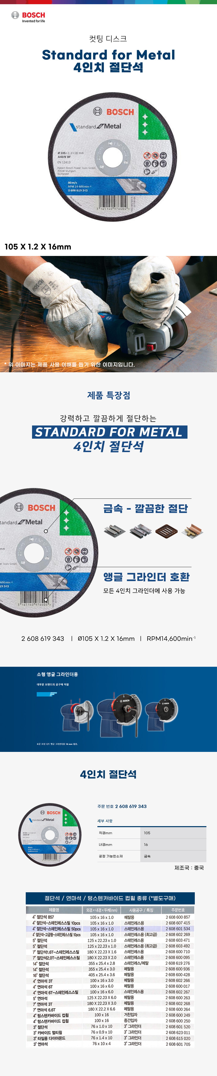 보쉬 4인치 절단석 2608619343 그라인더날 컷팅날 금속 메탈 철재