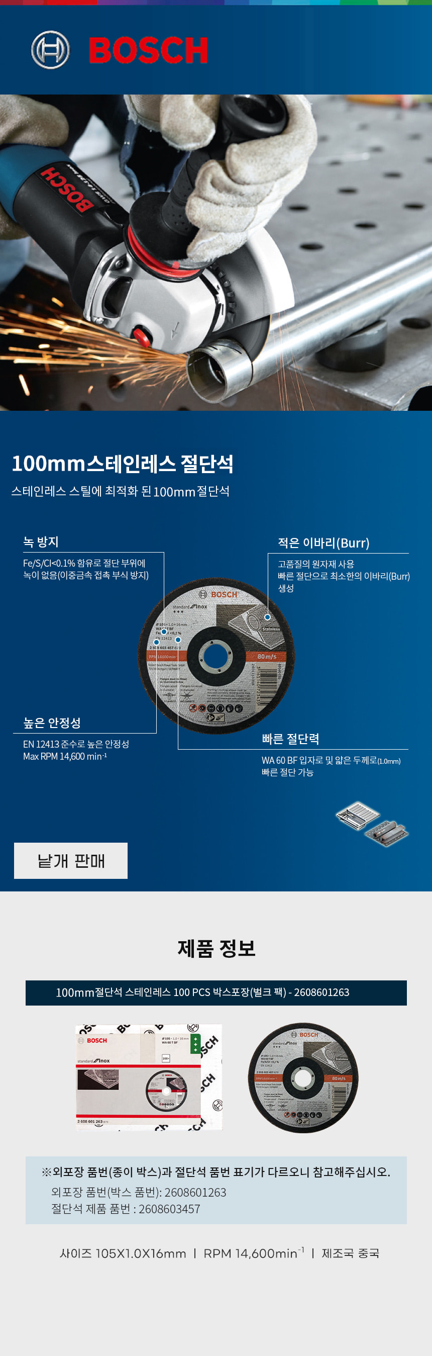 보쉬 4인치 절단석 그라인더날 컷팅날 2608603457(2608601263) 스텐 스테인레스