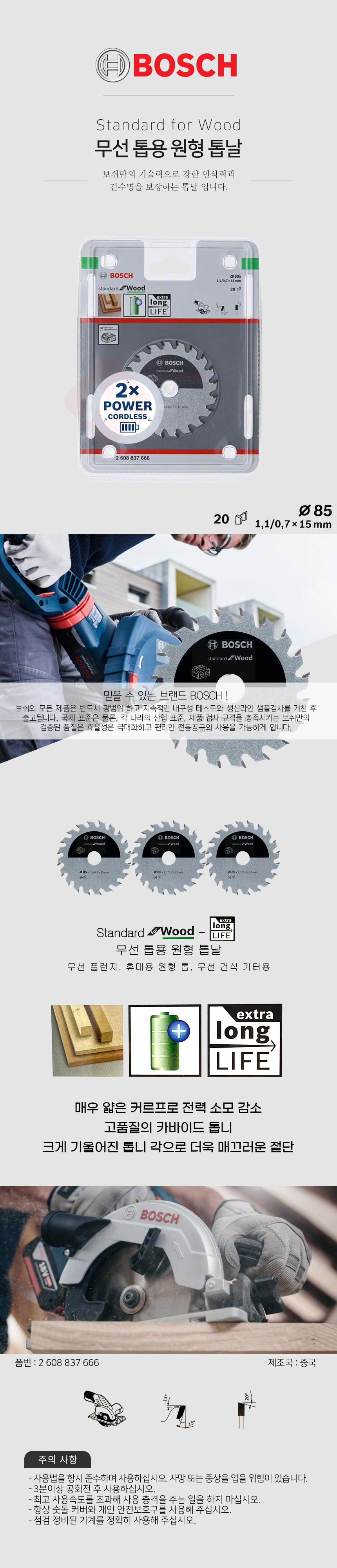 보쉬 무선 톱용 원형 톱날 85x1.1/0.7x15 T20 2608837666 목공 절단 팁쏘