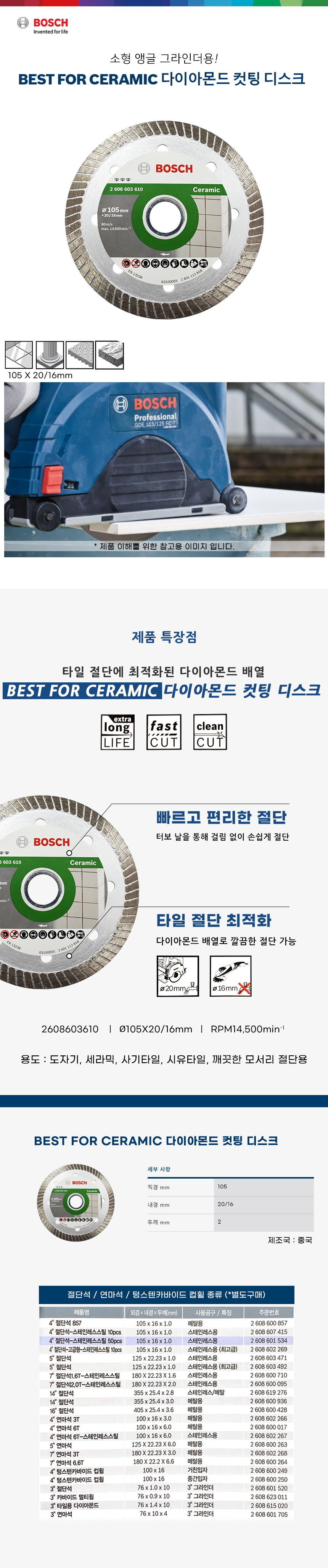 보쉬 4인치 다이아몬드 절단석 타일용 사기 시유 타일 그라인더날 2608603610(2608603615)