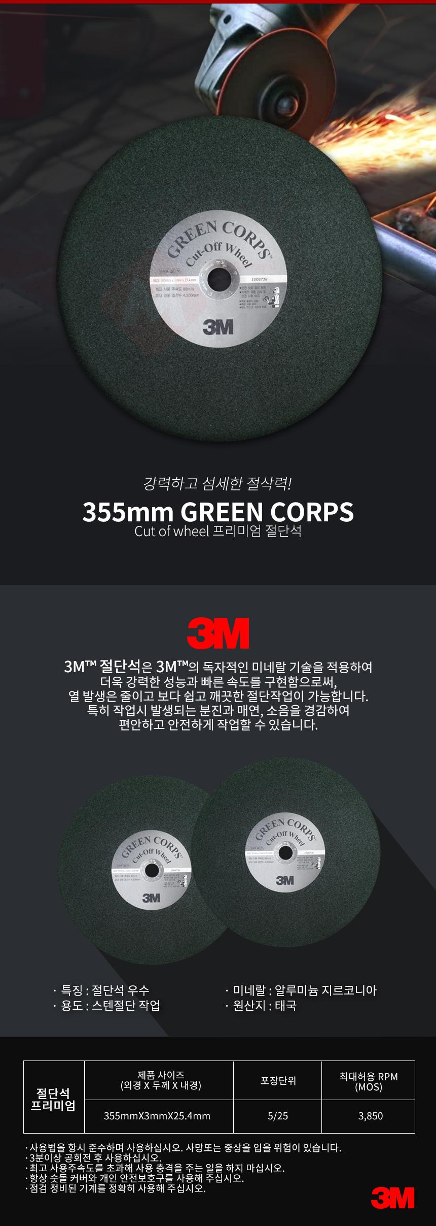 3M 14인치 절단석 프리미엄 그린 고속절단기용 고속절단기날 금속