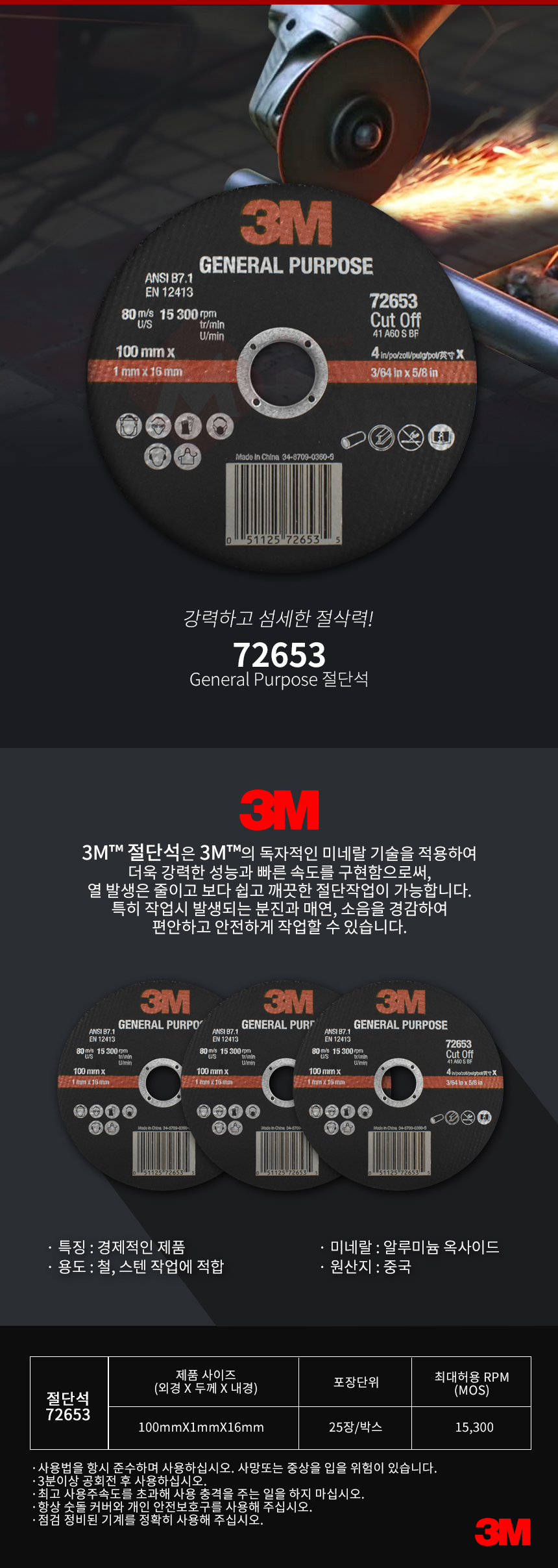 3M 4인치 절단석 72653 그라인더날 보급형
