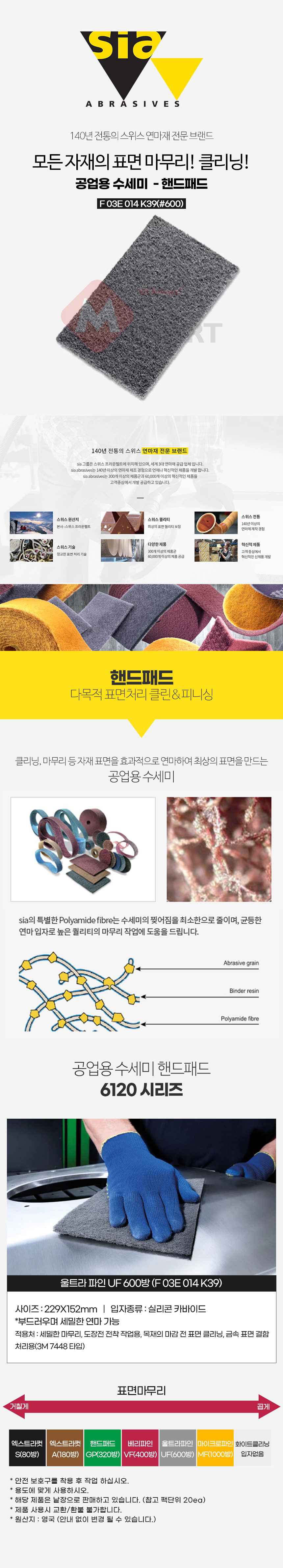 시아 공업용 수세미 핸드패드 낱장 울트라파인 UF 600방 F03E014K39 229X152 금속 목재 마무리 샌딩 사포