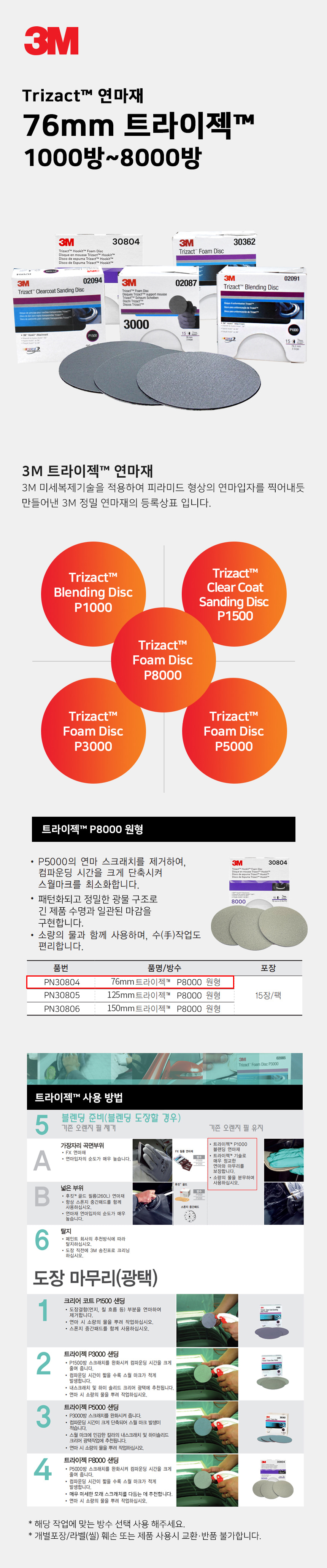3M 트라이젝 3인치 30804 P8000 15매 원형 연마지 샌딩 폴리싱 연마 마무리 제거 세차 광택