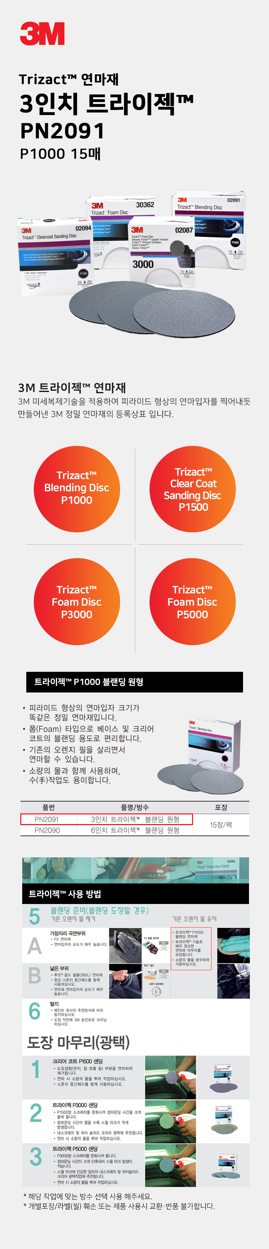 3M 트라이젝 3인치 02091(50413) P1000 15매 블랜딩 원형 연마지 샌딩 폴리싱 연마 마무리 제거 세차 광택