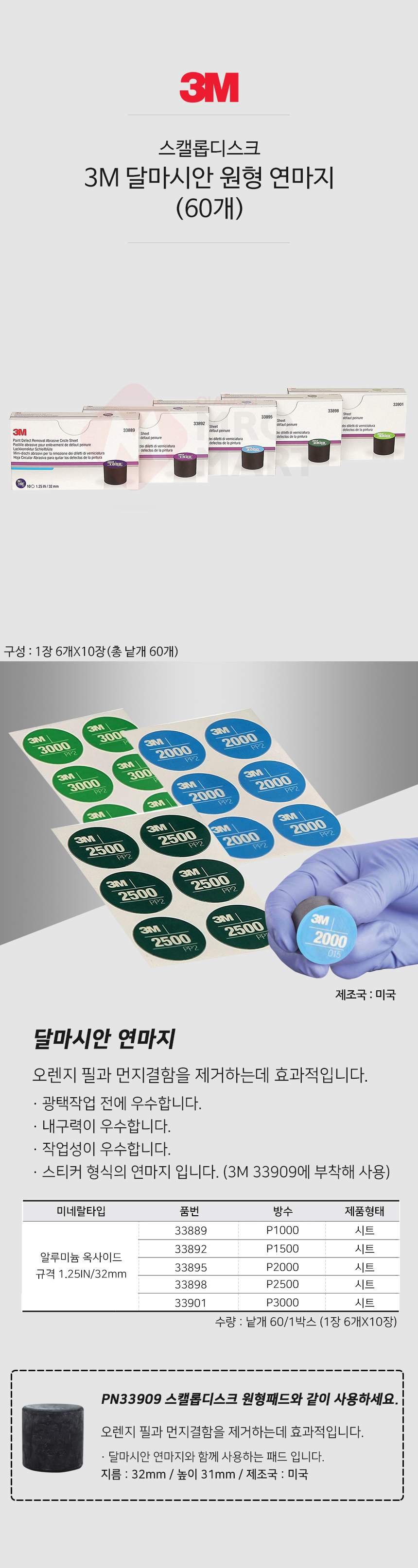 3M 264L 달마시안 원형 연마지 스캘롭 디스크 샌딩 연마 사포 오렌지필