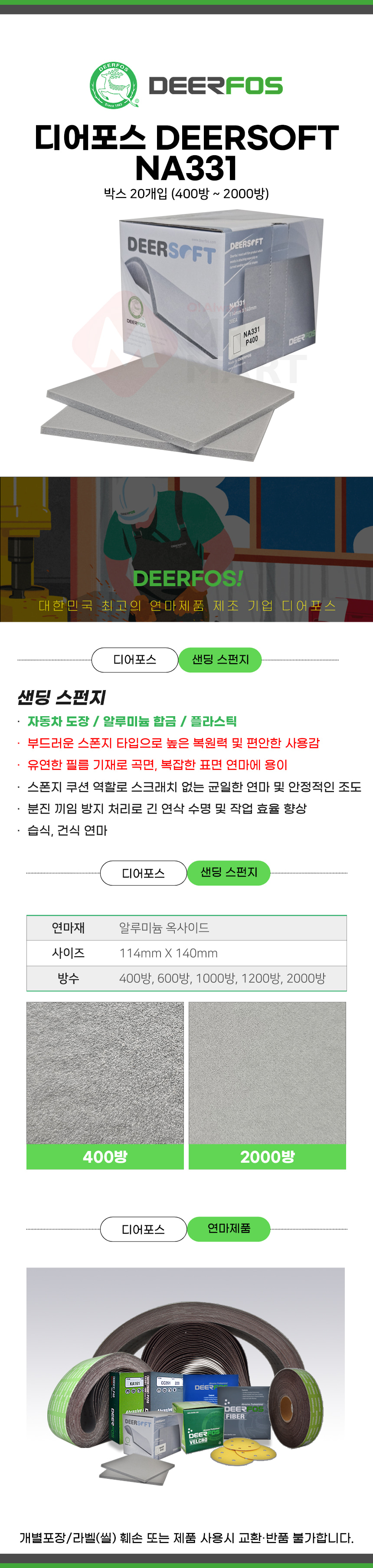 디어포스 디어 소프트 NA331 사각 샌딩 스펀지 20개입 사포 빼빠 플라스틱 알루미늄 합금 자동차