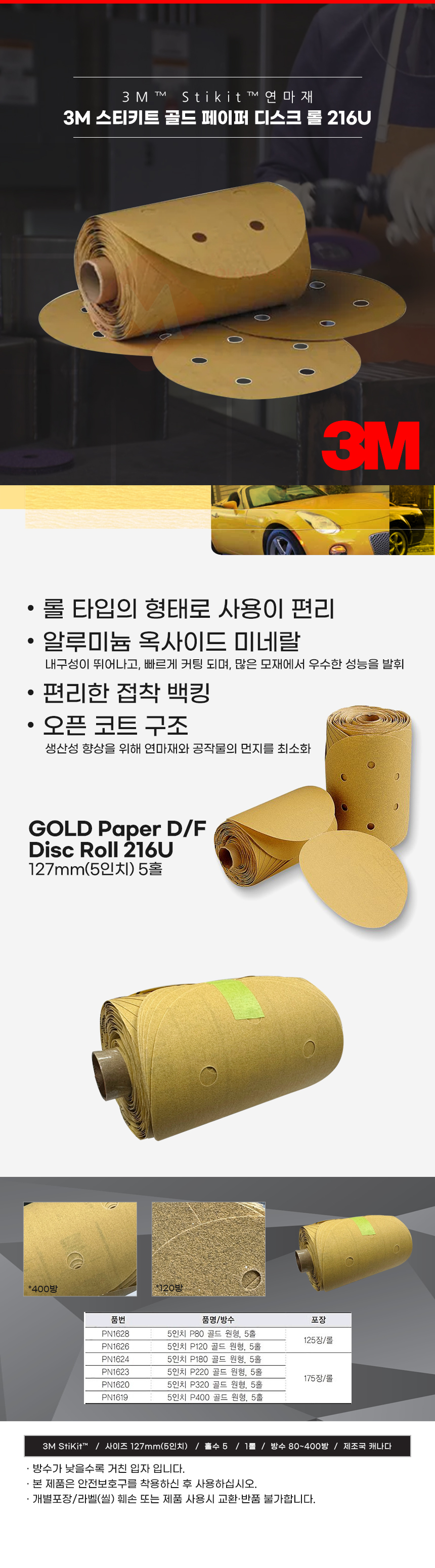 3M 스티키트 골드 디스크 원형 216U 5인치 5홀 1롤 120방 PN1626 접착식 사포 페이퍼 샌딩