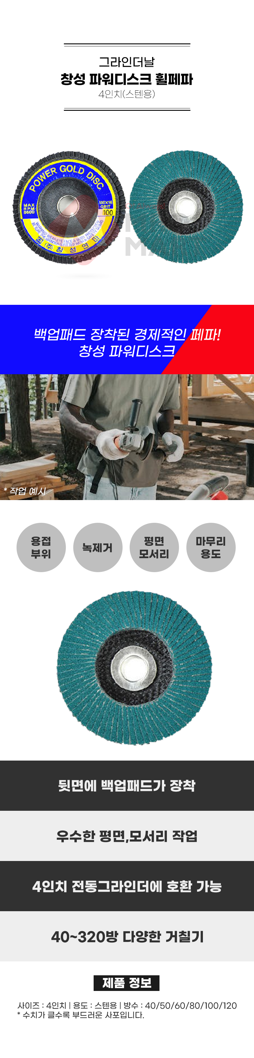 창성 파워디스크 휠 페파 4인치 스텐 날개 해바라기 디스크 휠 사포 연마 연삭