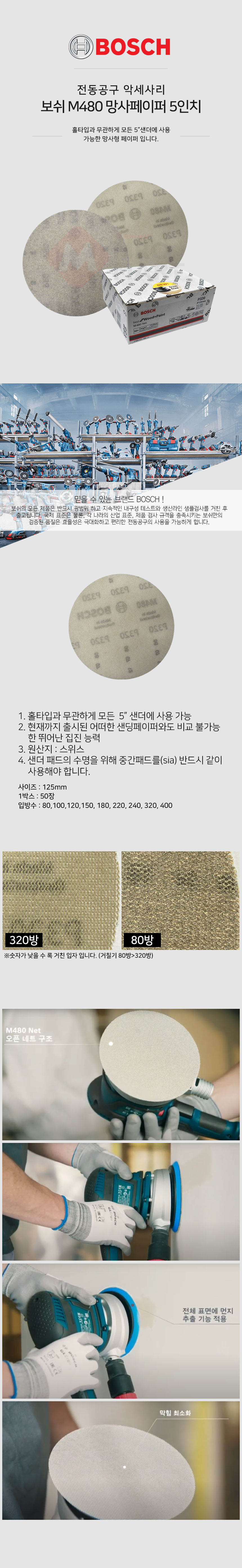 보쉬 EXPERT M480 샌딩 망사 페이퍼 5인치(50매입) 페파 사포 샌더기