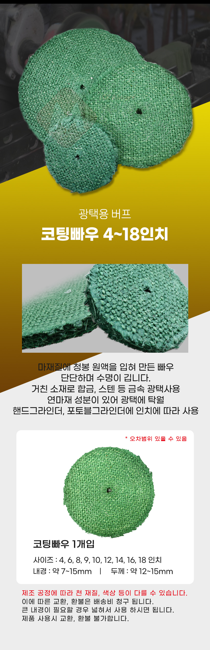 코팅빠우 4인치~18인치 버핑 광택 휠 광택 작업 연마