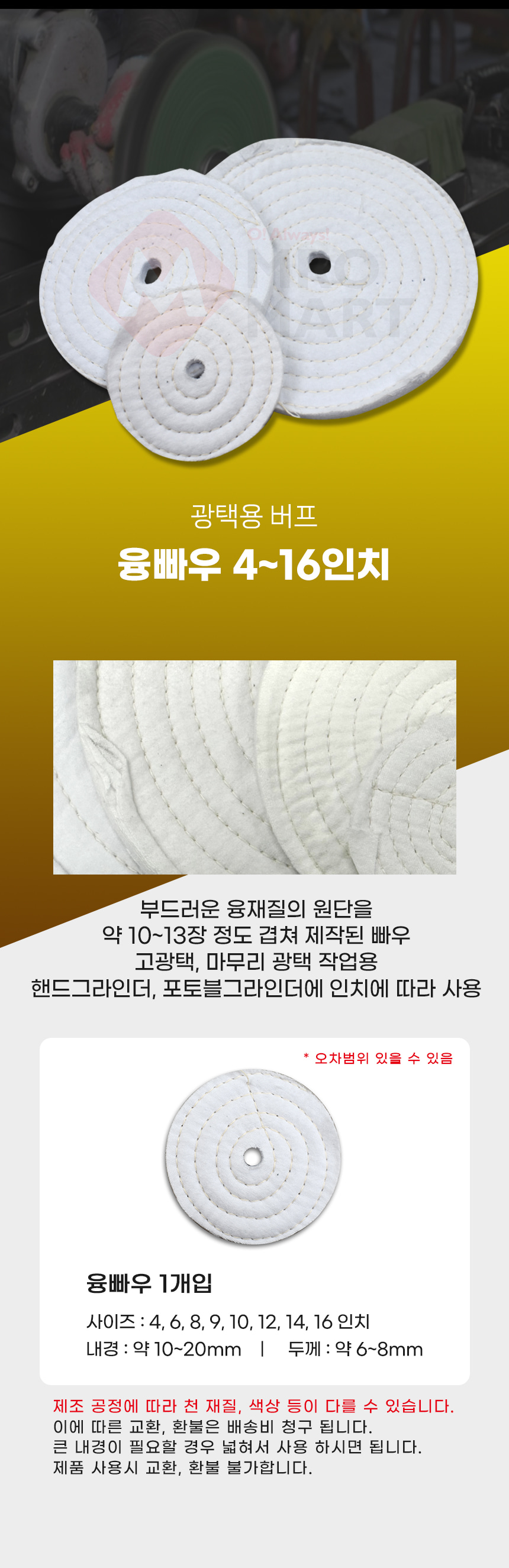 융빠우 4인치~14인치 버핑 광택 휠 광택 작업 연마