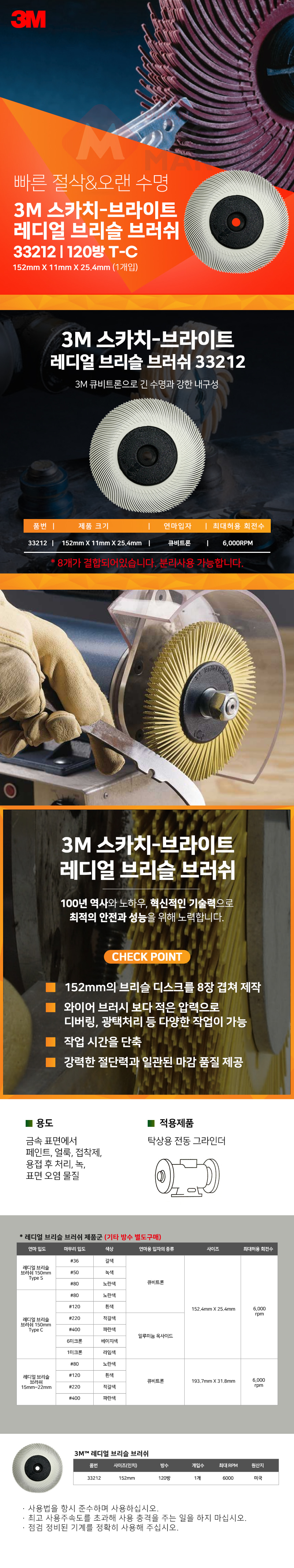 3M 스카치브라이트 레디얼 브리슬 브러쉬 33212 6인치 120방 연마 녹 페인트 제거
