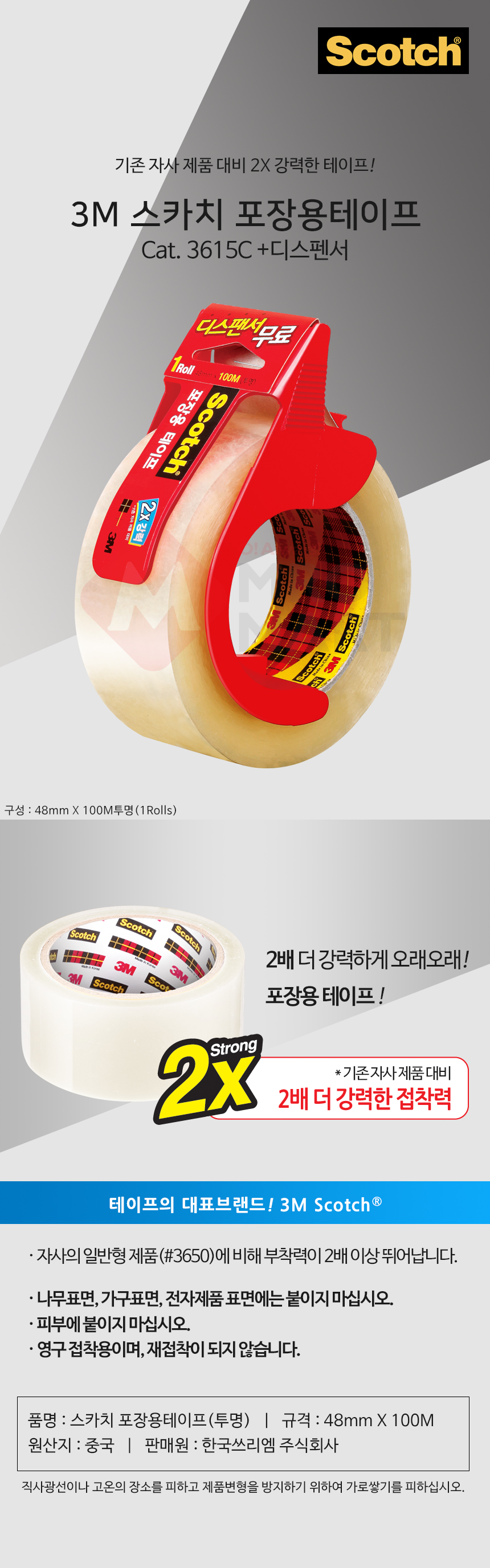 3M 스카치 포장용 투명 박스 테이프 48mmX100M 3615C 낱개 디스펜서 커터기 포함