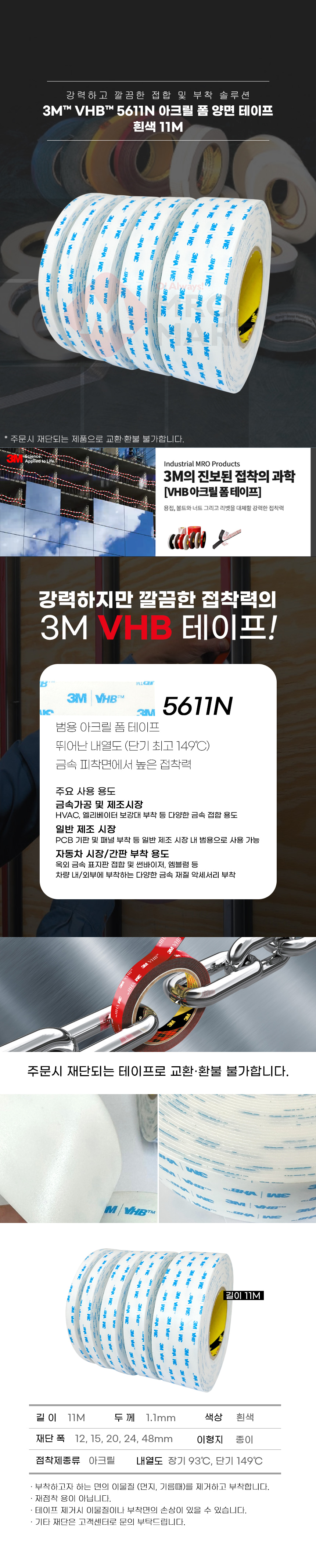 3M VHB 5611N 아크릴 폼 양면 테이프 11M 흰색