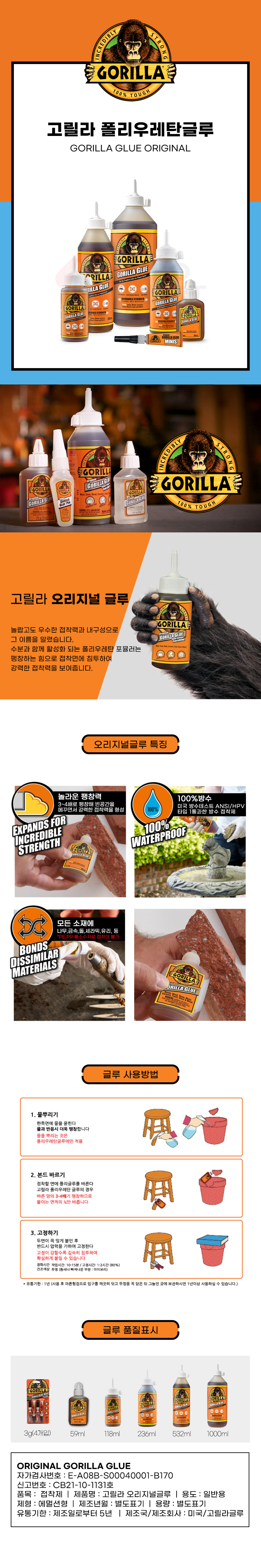 고릴라 폴리우레탄 글루 3g (4개입) 튜브형 초강력 다용도 방수 접착제